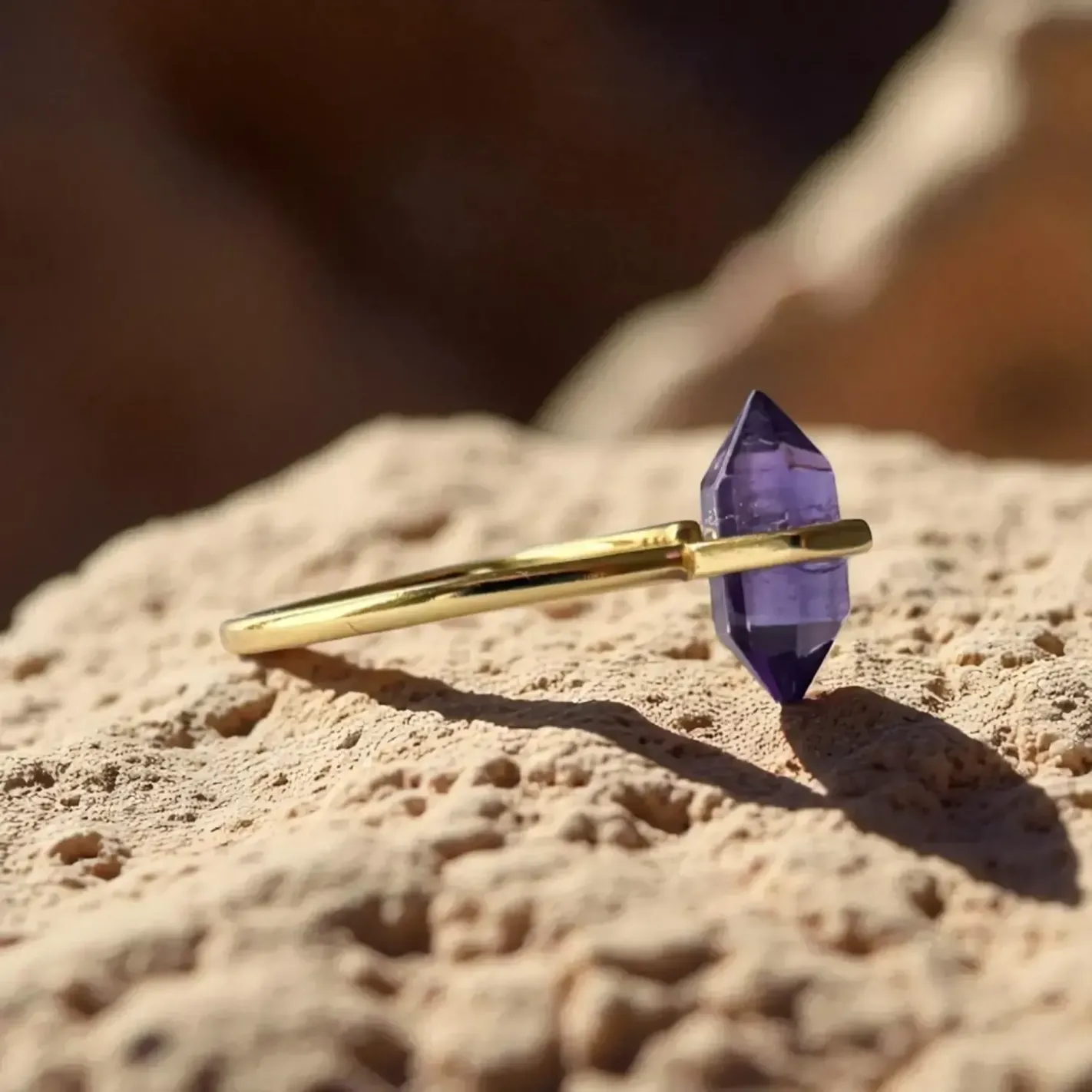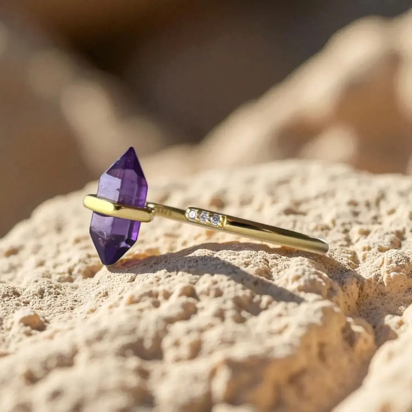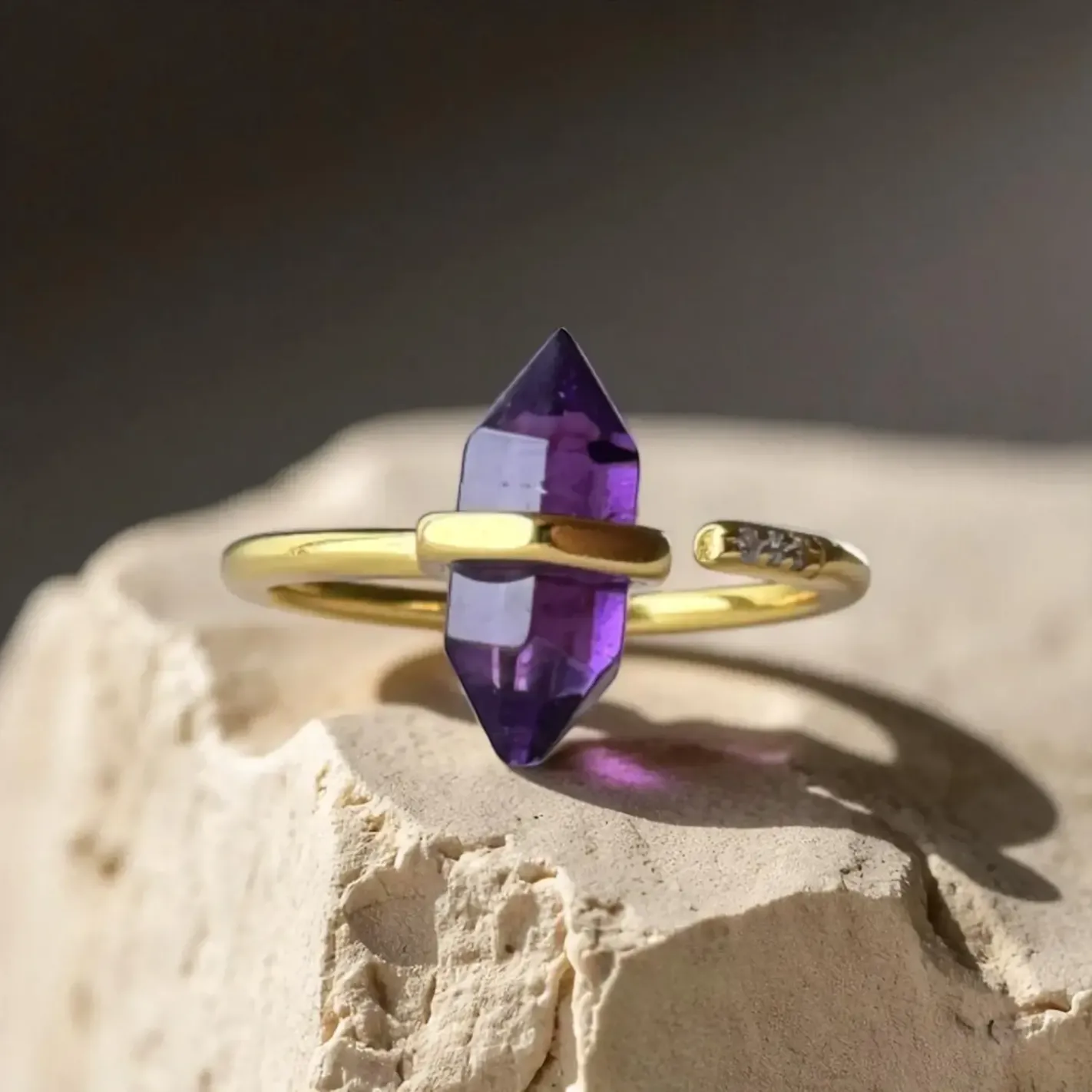 Une bague inspirée, dorée de lumière, ornée d’une pointe d’améthyste naturelle pour inviter la paix mentale et l’élévation de l’âme.