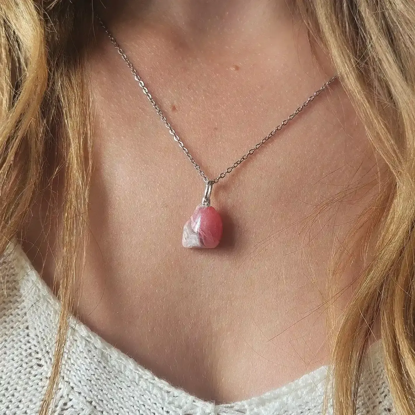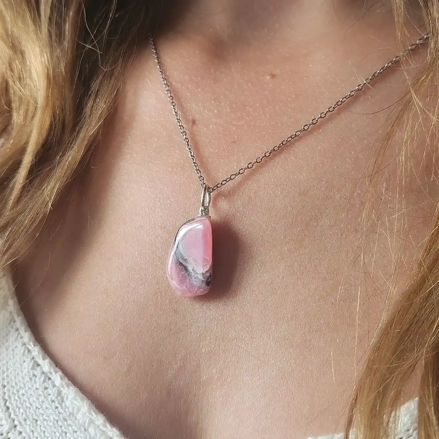 Porté près du cœur, le pendentif en Rhodochrosite agit comme une source lumineuse de tendresse, de douceur et de libération affective.