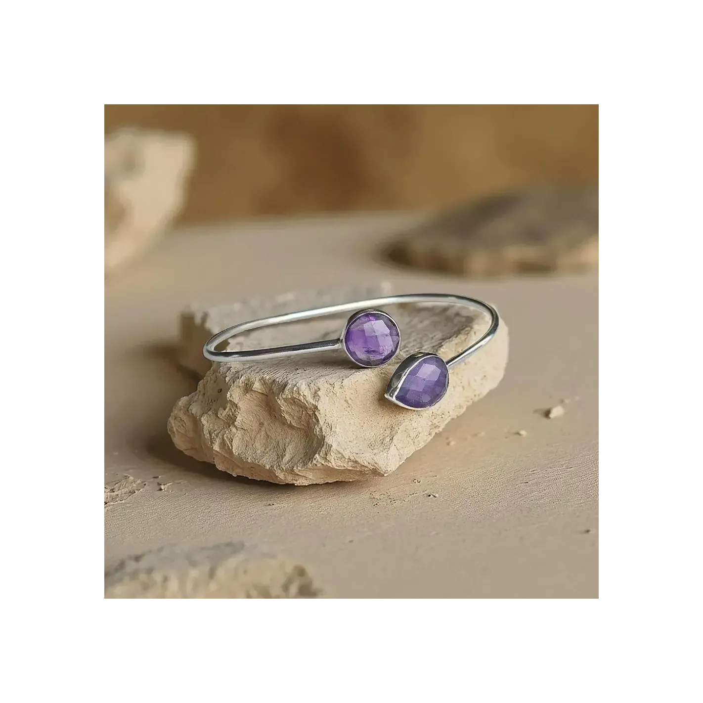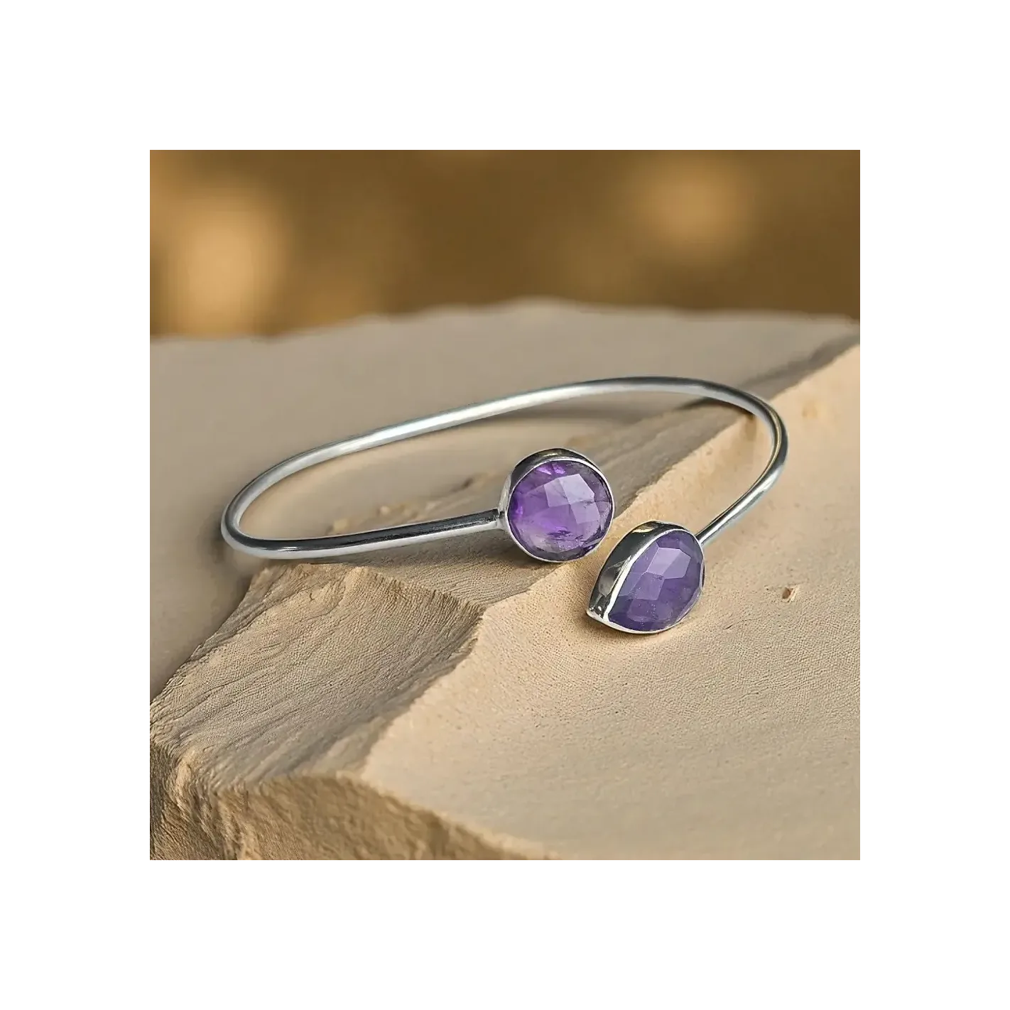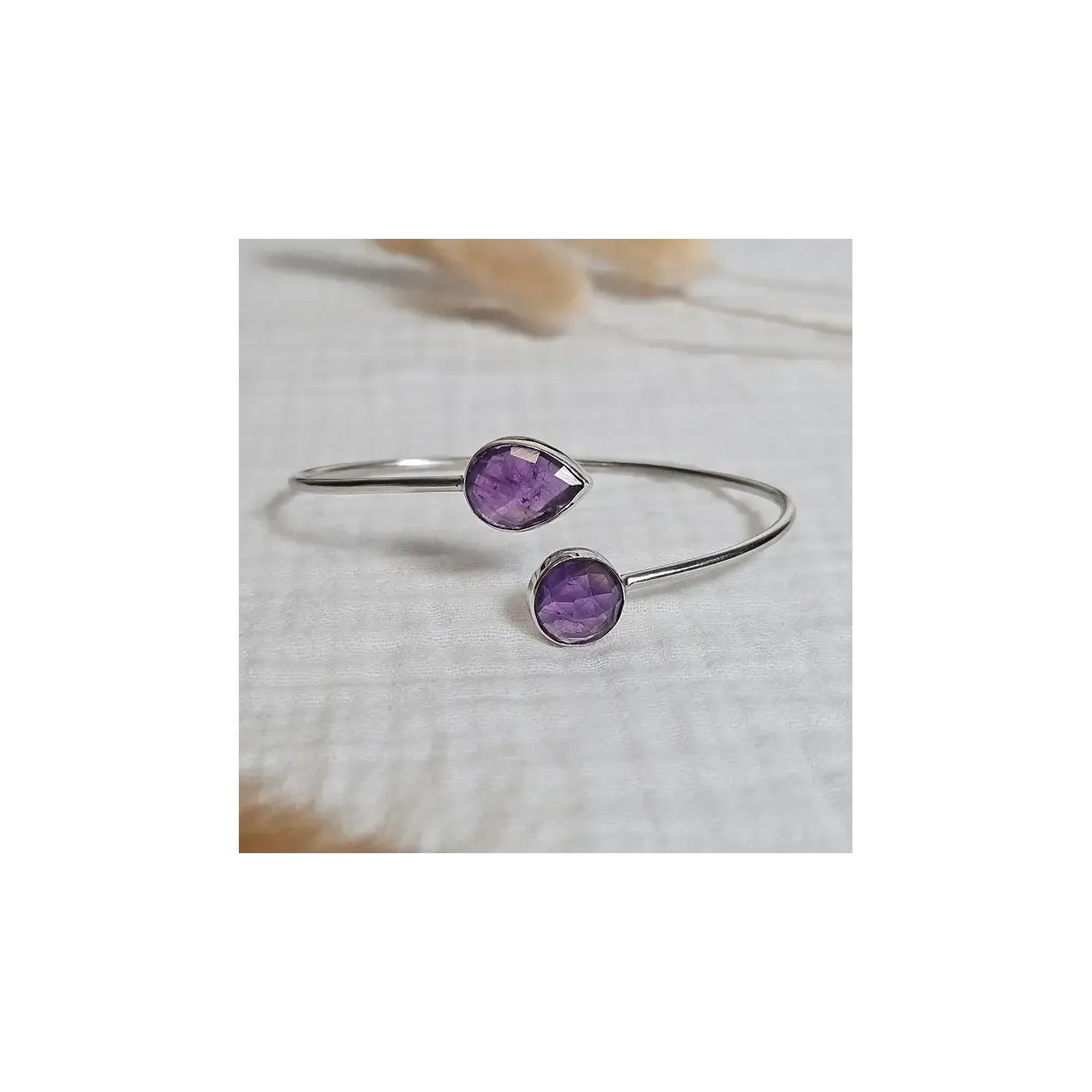 Laissez la lumière violette de l’Améthyste vous envelopper avec ce jonc en argent orné de deux pierres facettées – une invitation au calme intérieur et à la clarté spirituelle.