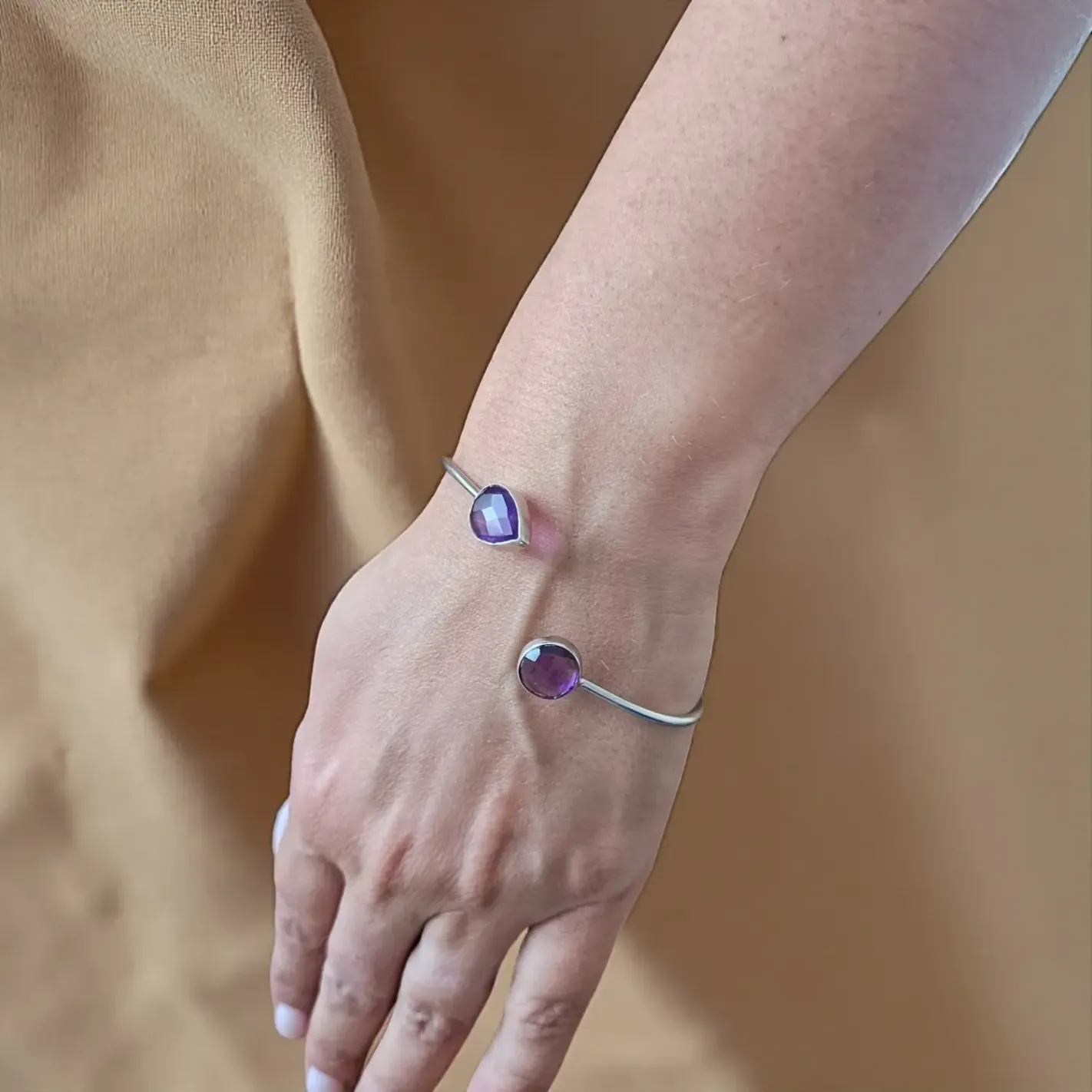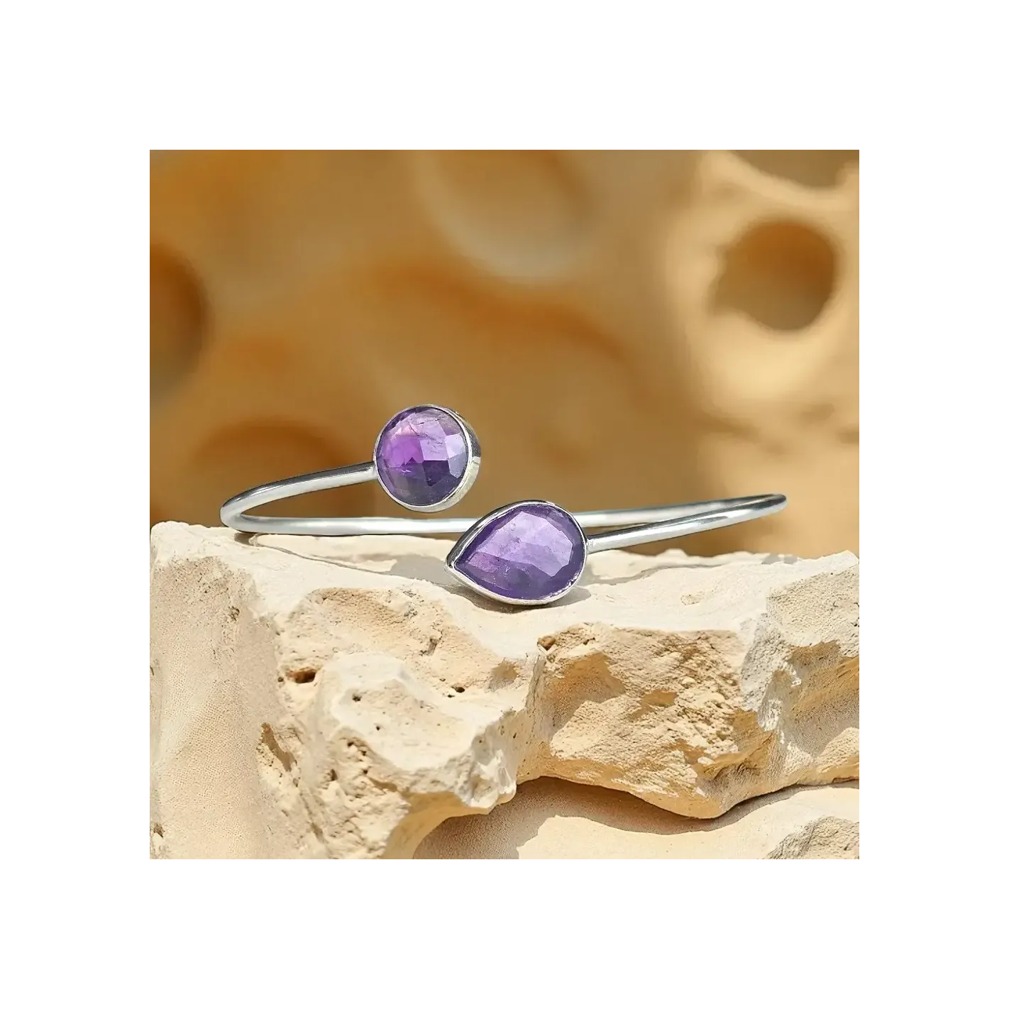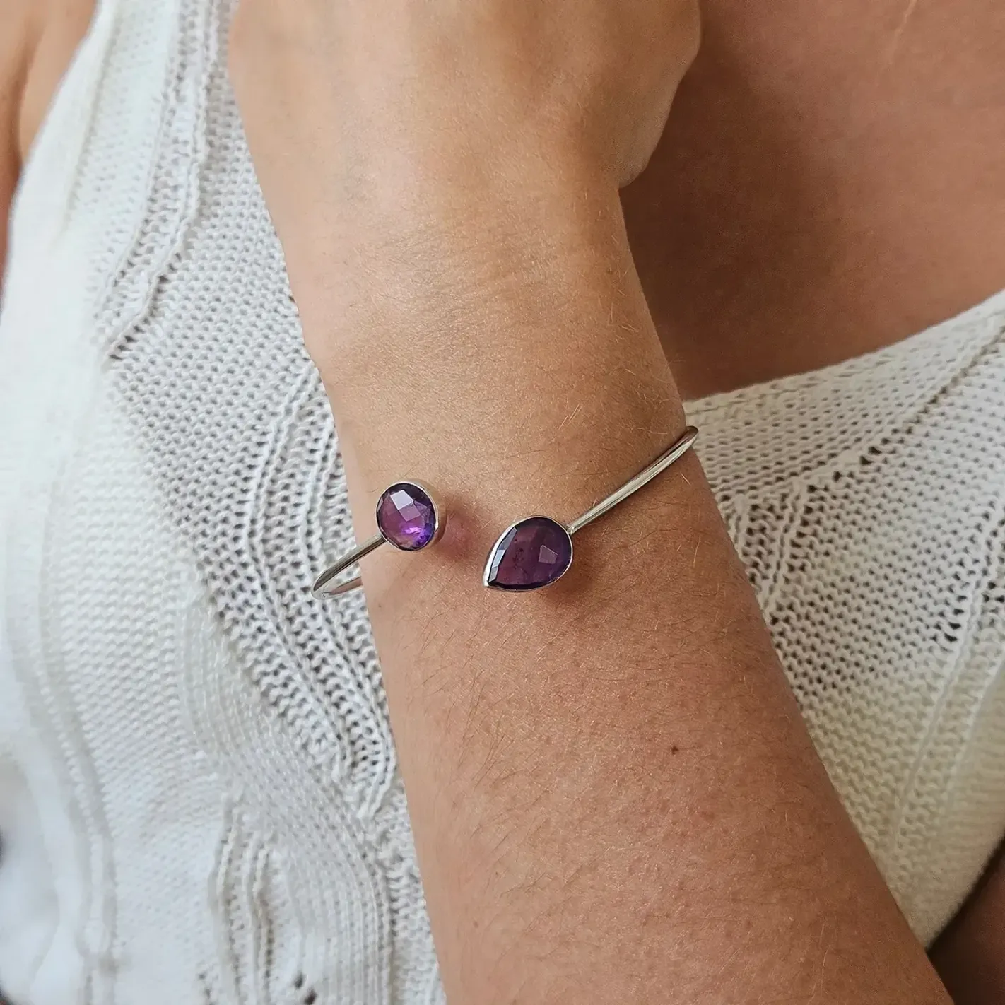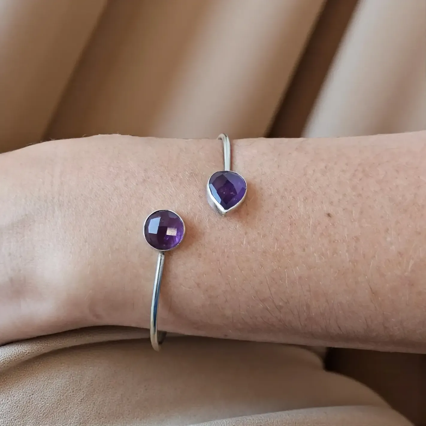 Laissez la lumière violette de l’Améthyste vous envelopper avec ce jonc en argent orné de deux pierres facettées – une invitation au calme intérieur et à la clarté spirituelle.