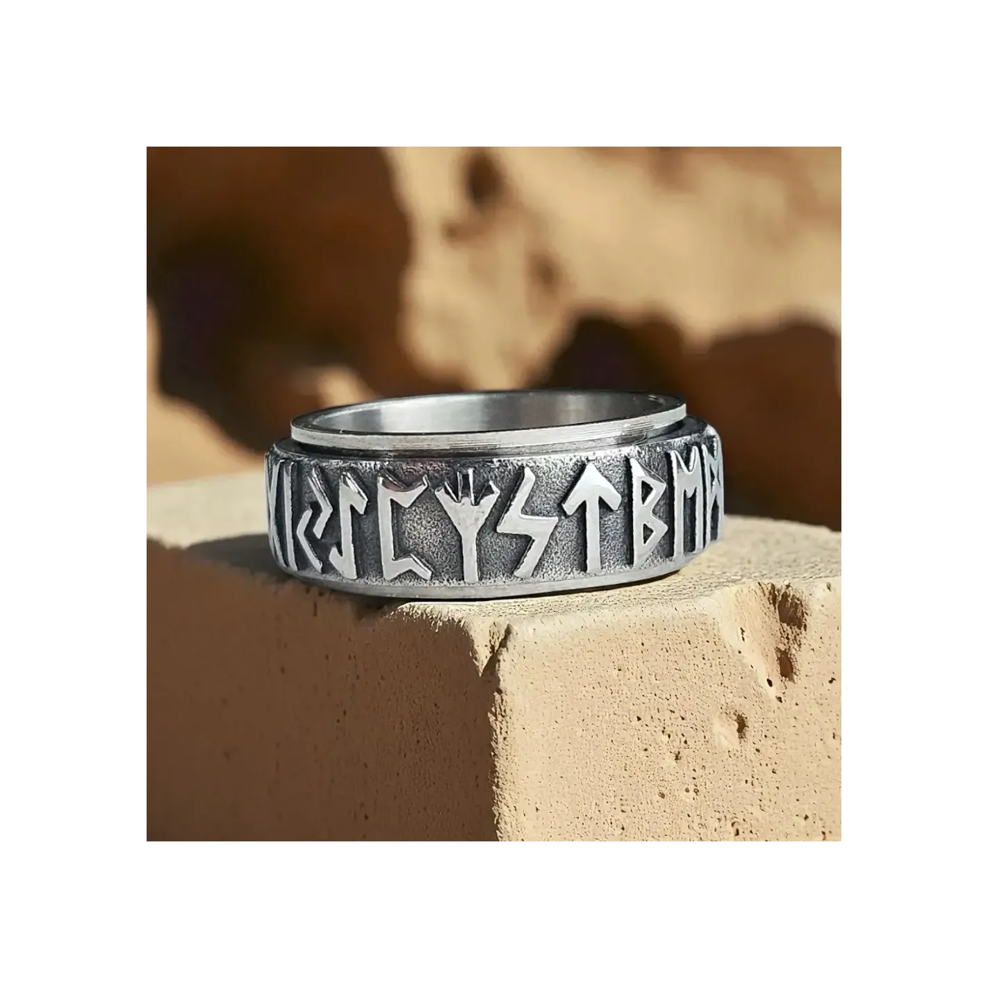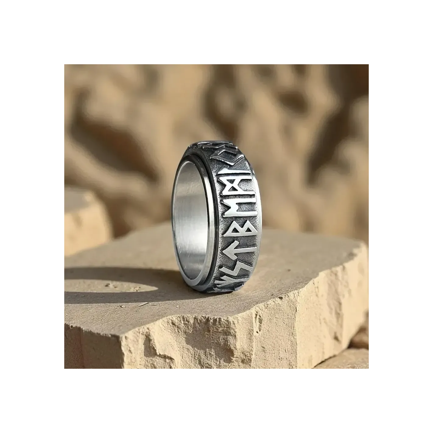 Son design imposant est rehaussé par des runes gravées en relief, qui renforcent son côté authentique et mystique. Son anneau central rotatif permet de favoriser la concentration et d’apaiser l’anxiété, en offrant un mouvement fluide et apaisant.