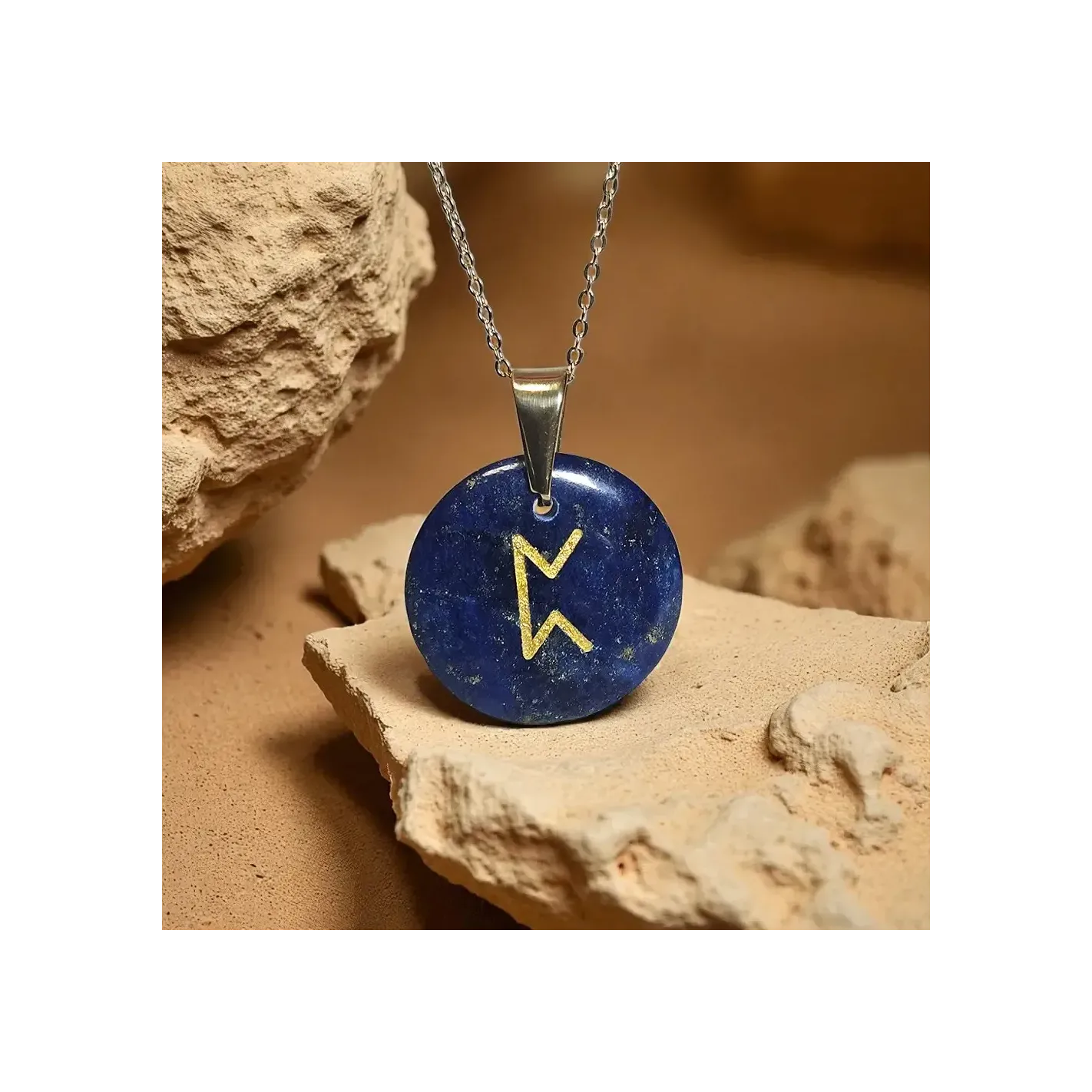 Utilisé depuis l’Égypte ancienne, le lapis lazuli est une pierre de sagesse, de vérité et de vision spirituelle. Elle est étroitement liée au chakra du troisième œil, centre de la perception intérieure. En lithothérapie, elle favorise la paix intérieure, la lucidité mentale et la communication avec le soi supérieur ou les guides spirituels. Son alliance avec la rune Perthro en fait un talisman puissant, propice aux révélations intuitives et aux prises de conscience.