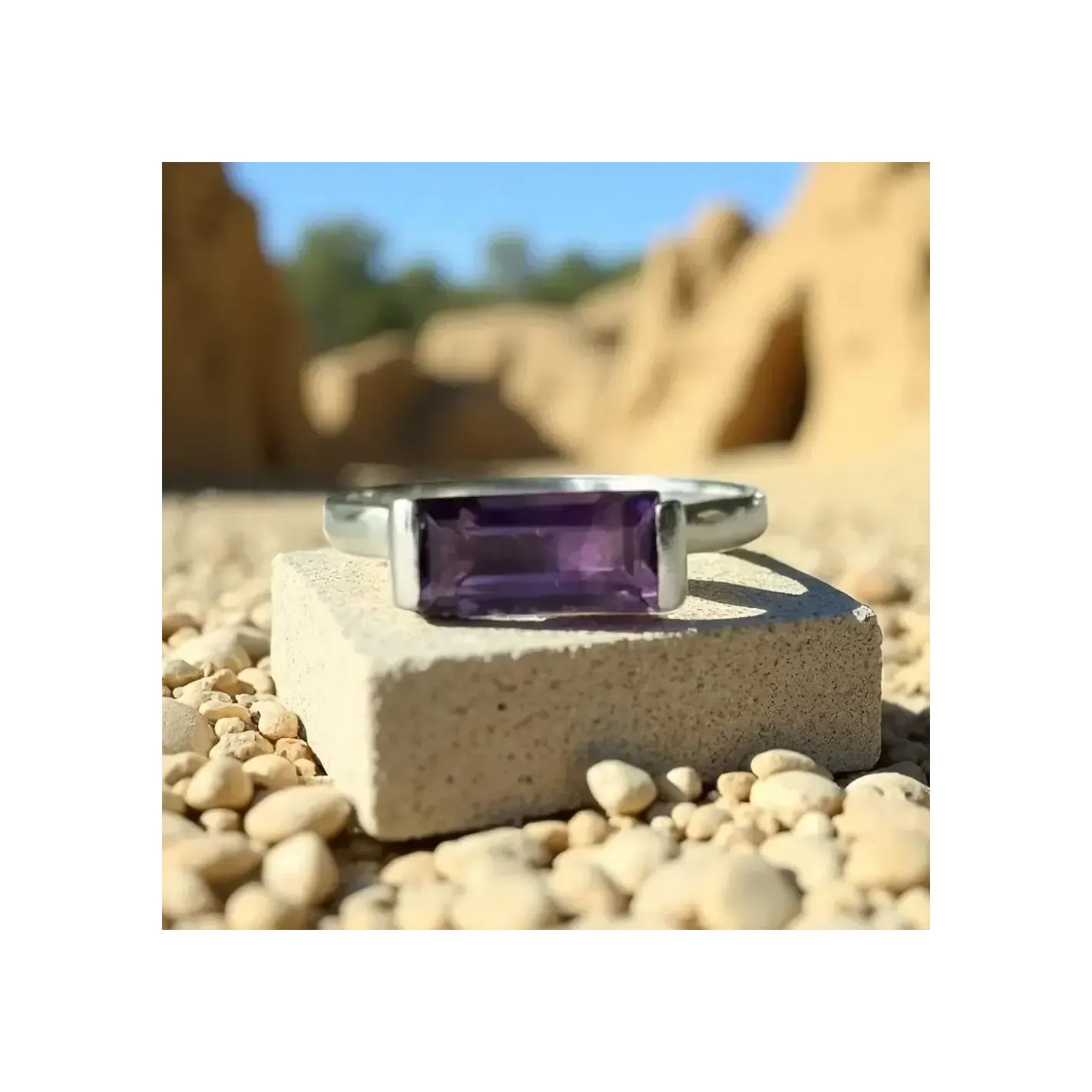Élégante et intemporelle, la bague Romaine améthyste facettée sur argent sublime l’intuition et la clarté mentale avec une pierre fine taillée entre 7 mm et 1 cm.
