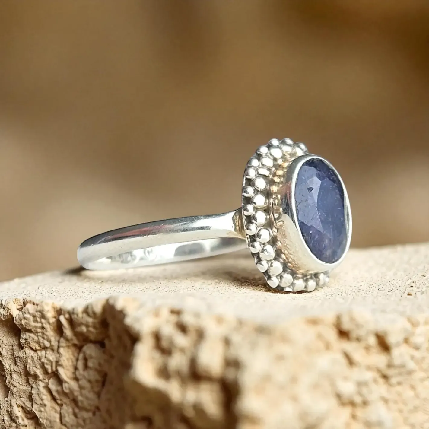 Le saphir, pierre de vérité, d’intuition et de clarté mentale, est ici taillé en ovale (8 mm x 5 mm) et monté sur un anneau en argent fin. Il agit puissamment sur le chakra du troisième œil et de la gorge, favorisant l’expression juste, la concentration profonde et la guidance intérieure. C’est une pierre précieuse associée à la sagesse, à la loyauté et à la paix intérieure. Elle est idéale pour soutenir une quête spirituelle, affiner la perception subtile et renforcer la stabilité mentale dans les périodes d’introspection ou de recherche de sens.