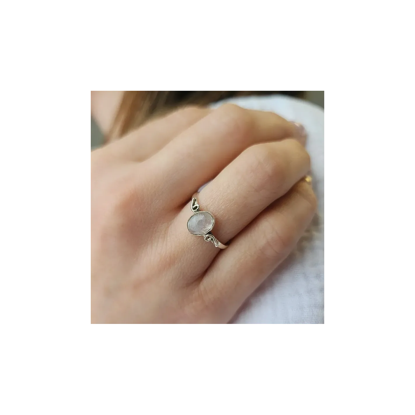 La pierre de lune est la pierre des cycles, de la féminité et de l’intuition. Dans cette version Angel, elle est taillée en ovale (8 mm x 5 mm) et montée sur un anneau fin en argent, mettant en valeur sa lueur nacrée et subtile. Elle agit sur le chakra sacré et le chakra du troisième œil, favorisant l’écoute intérieure, la douceur émotionnelle, la créativité inspirée et la réceptivité aux messages subtils. C’est une pierre idéale pour les personnes en quête d’harmonie émotionnelle, de fluidité intérieure et de reconnexion à leur dimension intuitive et sensible.