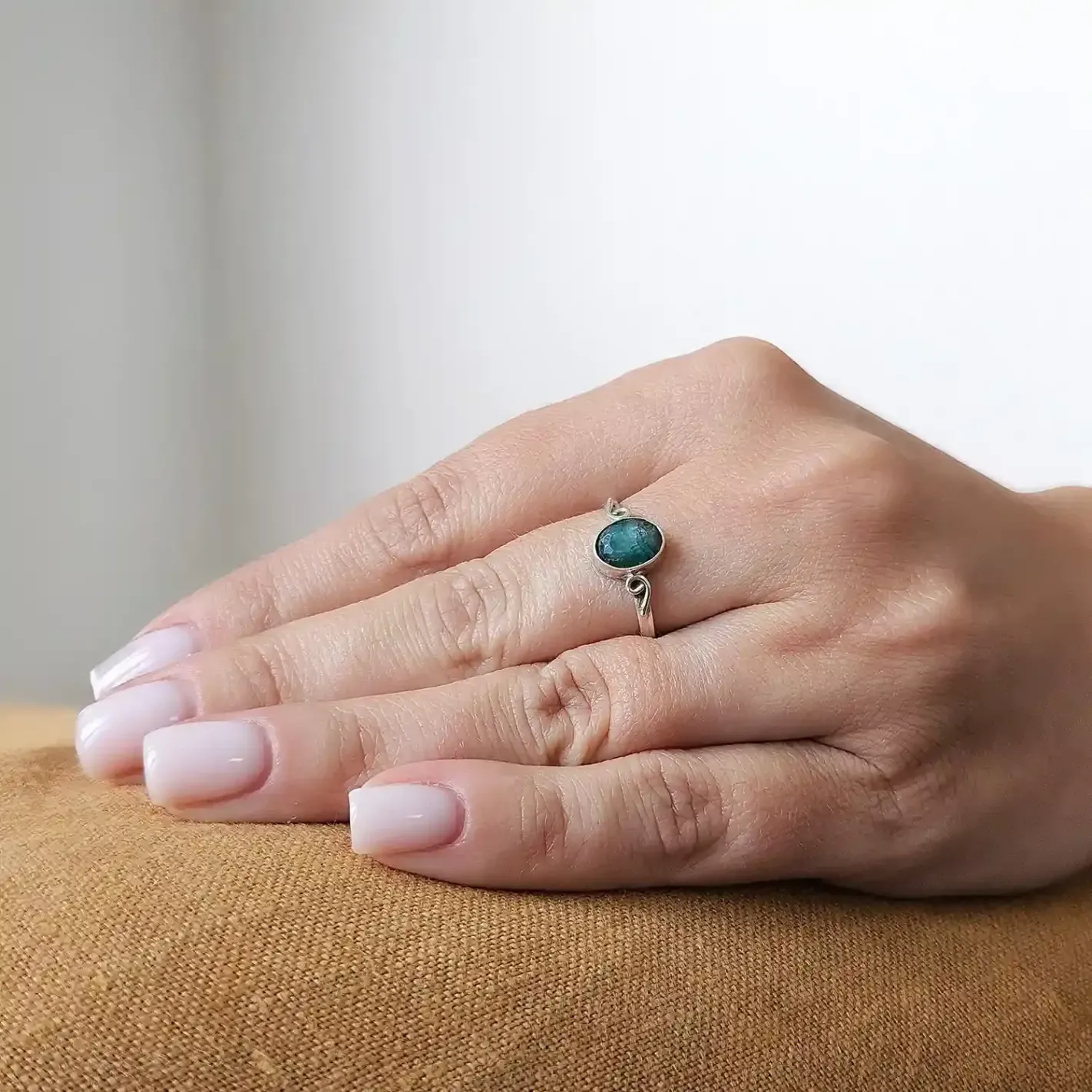 L’émeraude, pierre du cœur, de la guérison et de la sagesse, est ici taillée en ovale (8 mm x 5 mm) et montée sur un anneau fin en argent à l’esthétique délicate. Elle agit en douceur sur le chakra du cœur, soutenant l’équilibre affectif, la compassion, la vérité intérieure et l’authenticité dans les relations. Elle favorise la croissance personnelle, la guérison des blessures anciennes et le rayonnement d’un amour stable et sincère. C’est une pierre d’harmonie qui aide à rester centré dans l’amour même en période de turbulence émotionnelle.