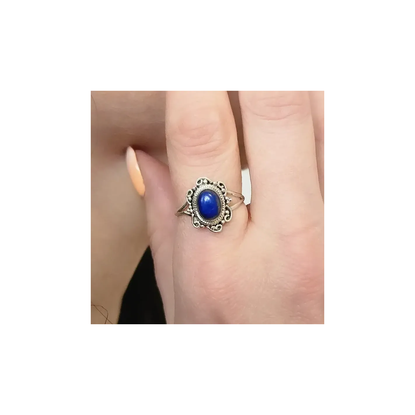 Le lapis-lazuli est une pierre de sagesse, d’intuition et de communication inspirée. Dans cette version Juliette, il est taillé en ovale (8 mm x 5 mm) et serti dans une monture en argent en forme de fleur délicatement travaillée. Il agit principalement sur le chakra de la gorge et du troisième œil, favorisant l’expression authentique, la lucidité et la confiance dans sa parole. Il soutient les personnes qui souhaitent clarifier leurs pensées, se faire entendre avec justesse ou affirmer leur vérité intérieure sans crainte.