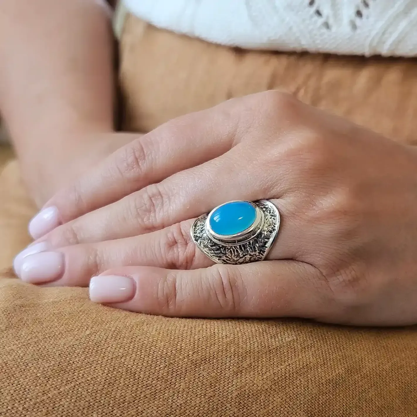 Cette bague en onyx bleu montée sur argent 925 déploie une vibration calme, posée et protectrice. L’onyx bleu, pierre de recentrage, favorise la maîtrise de soi, la lucidité et la stabilité émotionnelle. Sa teinte profonde évoque la clarté d’un ciel nocturne apaisé. Parfaite pour les moments où le mental s’emballe ou que la confiance en soi vacille, elle aide à retrouver son axe avec sobriété et force douce.