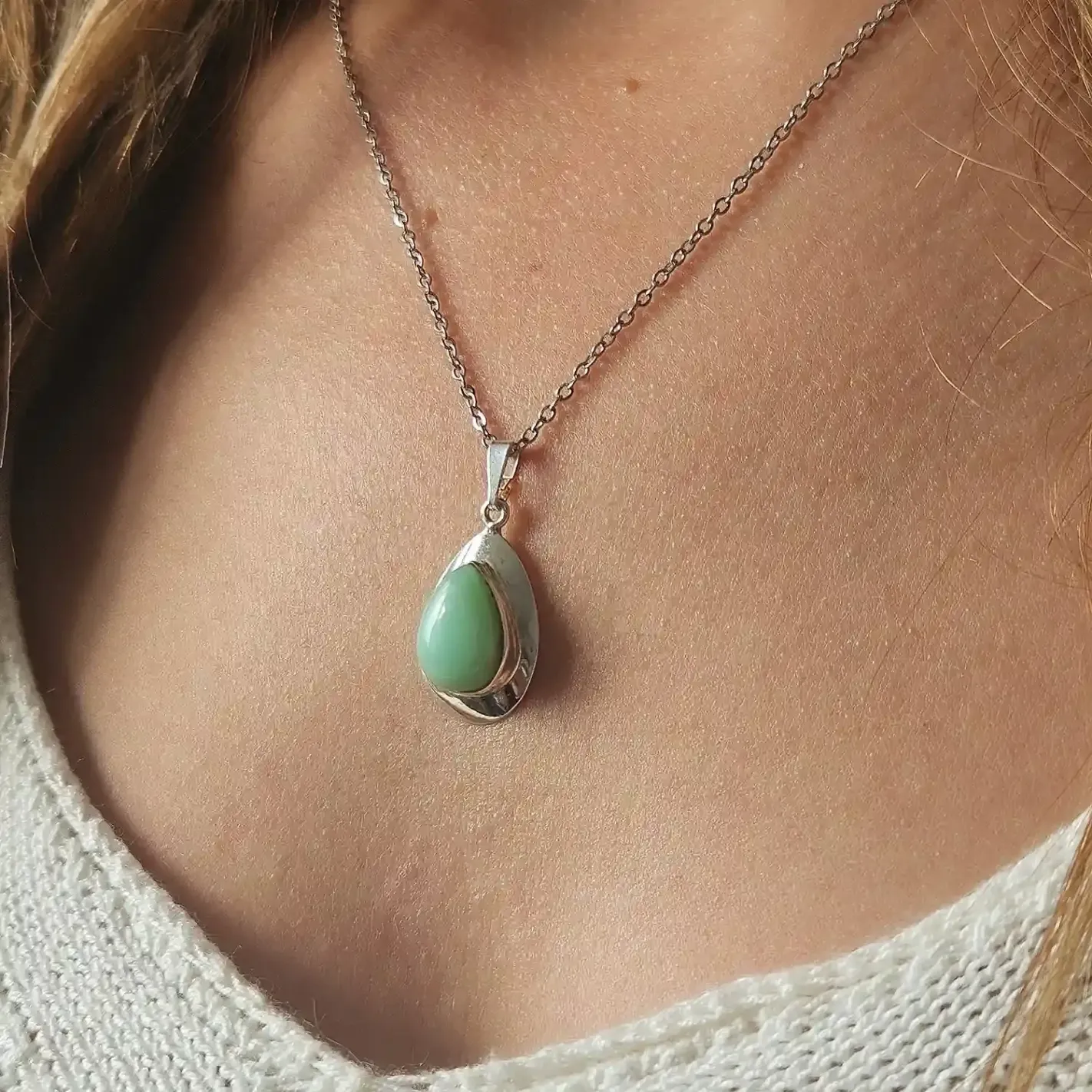 Le Jade est une pierre ancestrale de paix intérieure, d’abondance et de protection. Il équilibre les émotions, favorise la prospérité et soutient l’harmonie dans les relations. En pendentif goutte, il épouse le cœur et le chakra du cœur, diffusant son énergie douce et stabilisante tout au long de la journée. L’argent qui l’entoure amplifie sa vibration tout en apportant une connexion à la lune et à l’intuition.