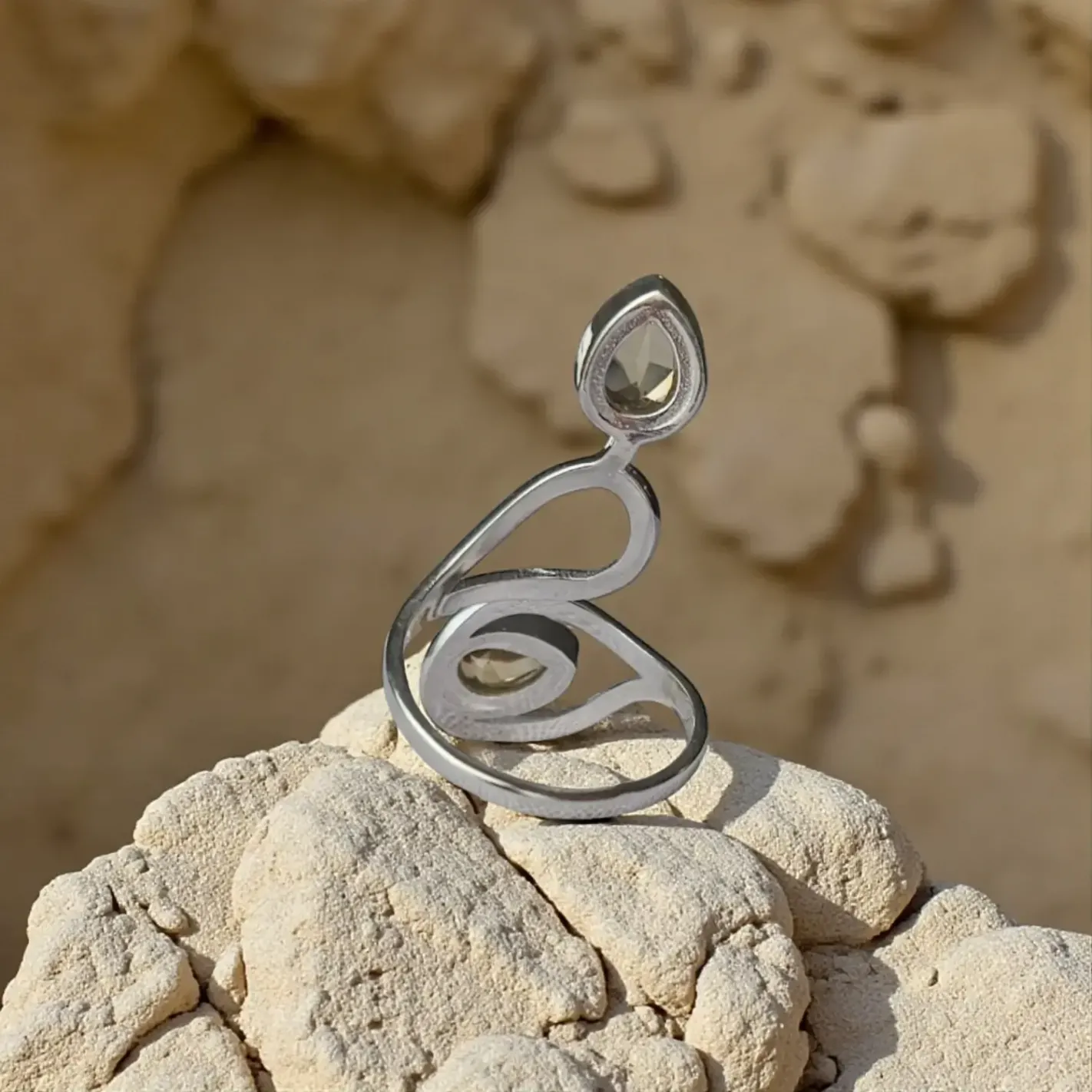 La Citrine est une pierre lumineuse associée à la prospérité, à la clarté mentale et à la joie de vivre. Elle agit sur le chakra du plexus solaire en stimulant l’énergie vitale, en dissipant les doutes et en renforçant la confiance. Cette bague, composée de deux pierres en forme de goutte montées en miroir, crée un équilibre harmonieux entre énergie et élégance.