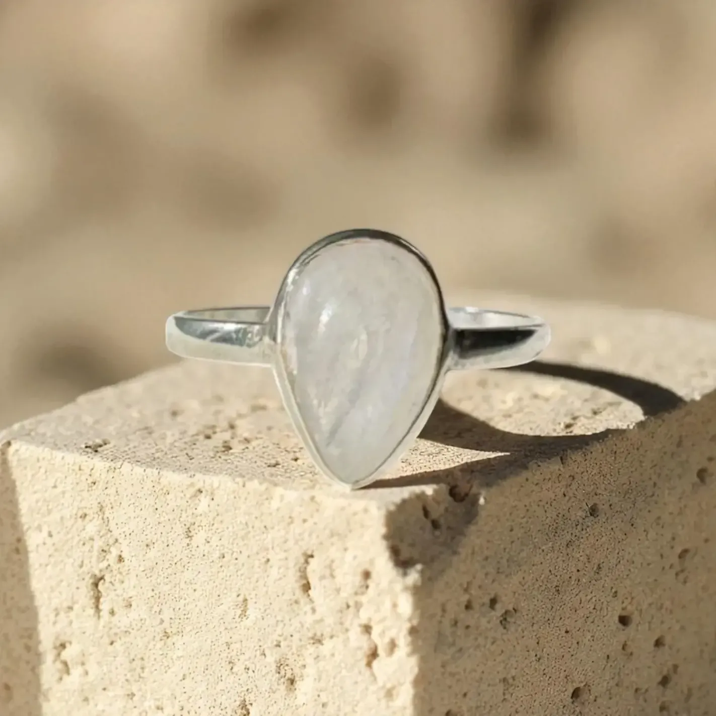 Une bague délicate et lumineuse en pierre de lune taillée en forme de poire, pour honorer la sensibilité, la créativité et l’énergie du féminin sacré.