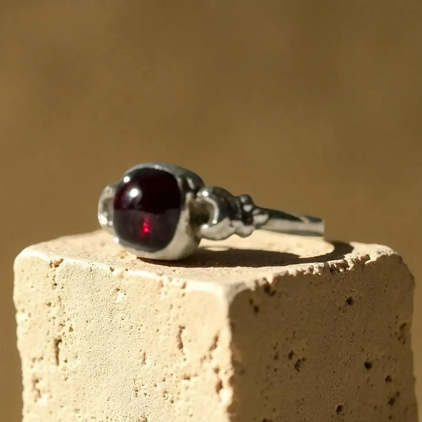 La bague Nora reflète la puissance enracinante du grenat, dans une monture argent fine et rayonnante. Un bijou vibrant d’énergie et de courage intérieur.