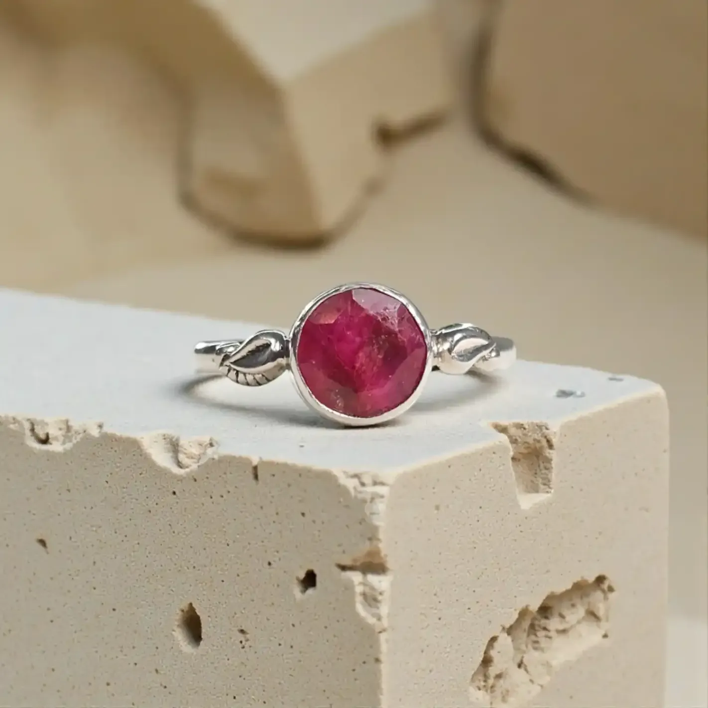 Bague Silwen Rhodochrosite naturelle, pierre ronde de 6 mm encadrée de deux petites feuilles argentées. Symbole de tendresse, d’harmonie et d’amour du cœur.