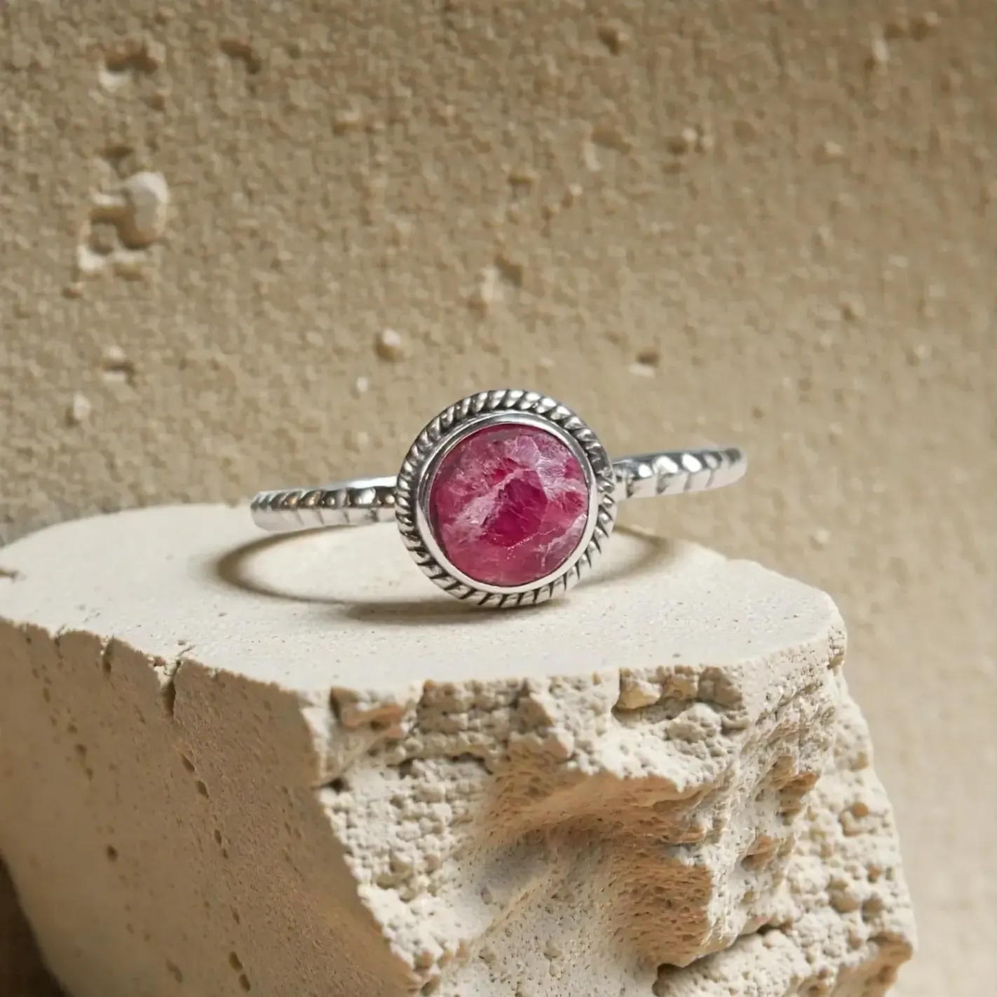 La bague Nimé, dans son expression la plus délicate, se pare d’une rhodochrosite ronde de 6 mm. Montée sur une monture argentée épurée, cette pierre rose veinée invite à la réconciliation avec le passé, à la libération émotionnelle et à la joie retrouvée. Un bijou intime et profondément réconfortant.