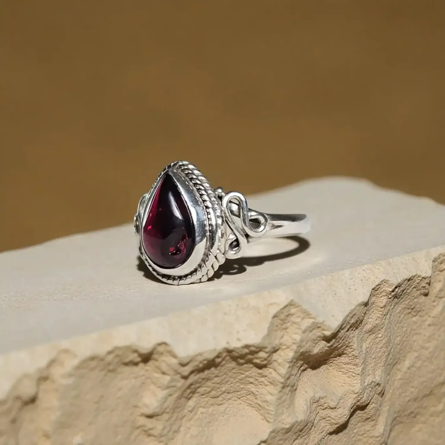 La bague Isalys révèle un grenat profond, en forme de goutte (8 mm sur 5 mm), délicatement serti sur une monture argentée. Sa silhouette évoque une larme de feu, une flamme douce et persistante. Elle incarne la force du cœur, l’amour profond et la vitalité enracinée.