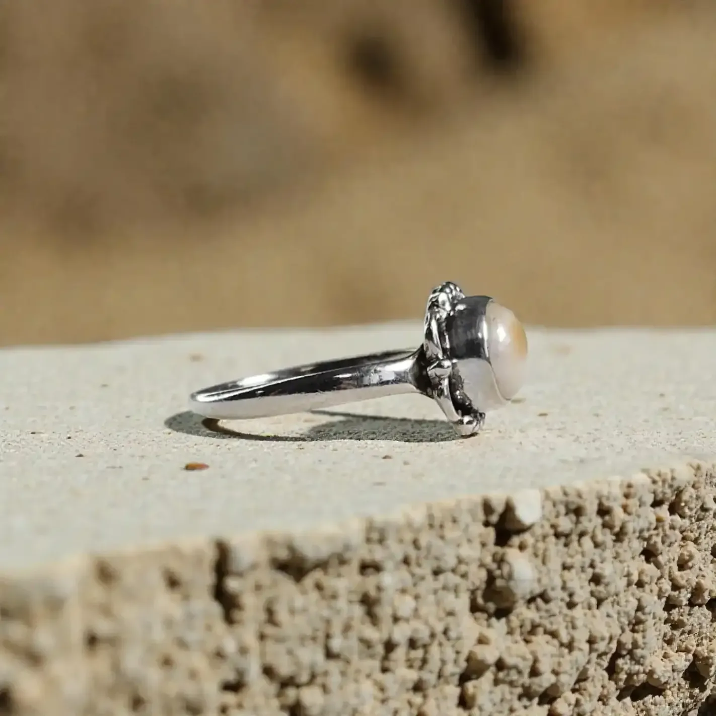 Bague Célia Perle en argent encerclée de petits détails arrondis. Élégance douce, intuition et sérénité en bijou.