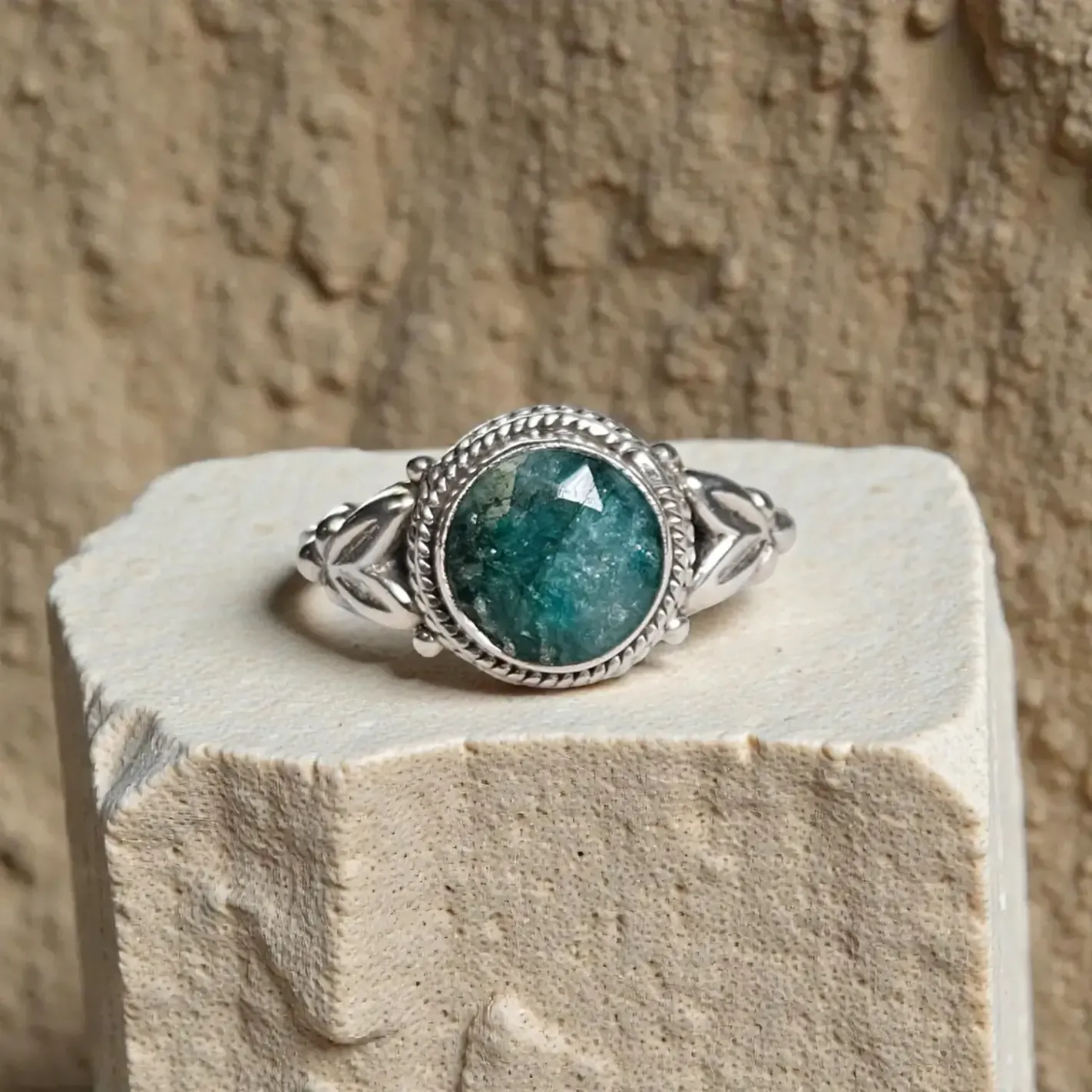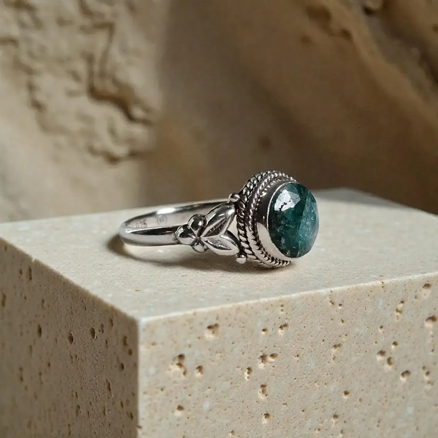 La bague Mirelda unit la finesse argentée aux symboles végétaux. En son centre, une émeraude naturelle ronde de 6 mm est délicatement enlacée par des feuilles sculptées, évoquant la régénération, la paix et la croissance intérieure.