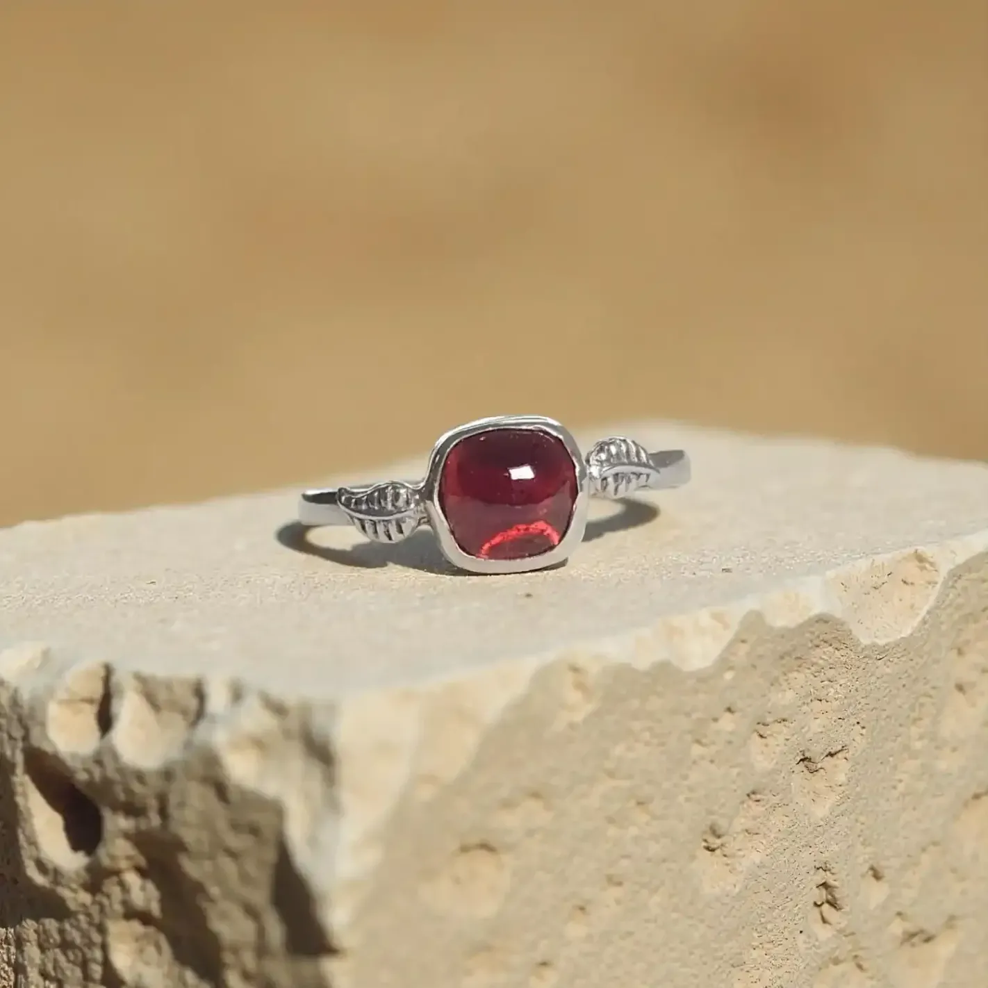 Sylia est une ode à la forêt et à la force de la terre. Cette bague allie la géométrie d’un grenat carré de 6 mm à la poésie de deux feuilles en argent qui l’entourent, telle une pousse protectrice. Une création qui relie énergie vitale et beauté organique.