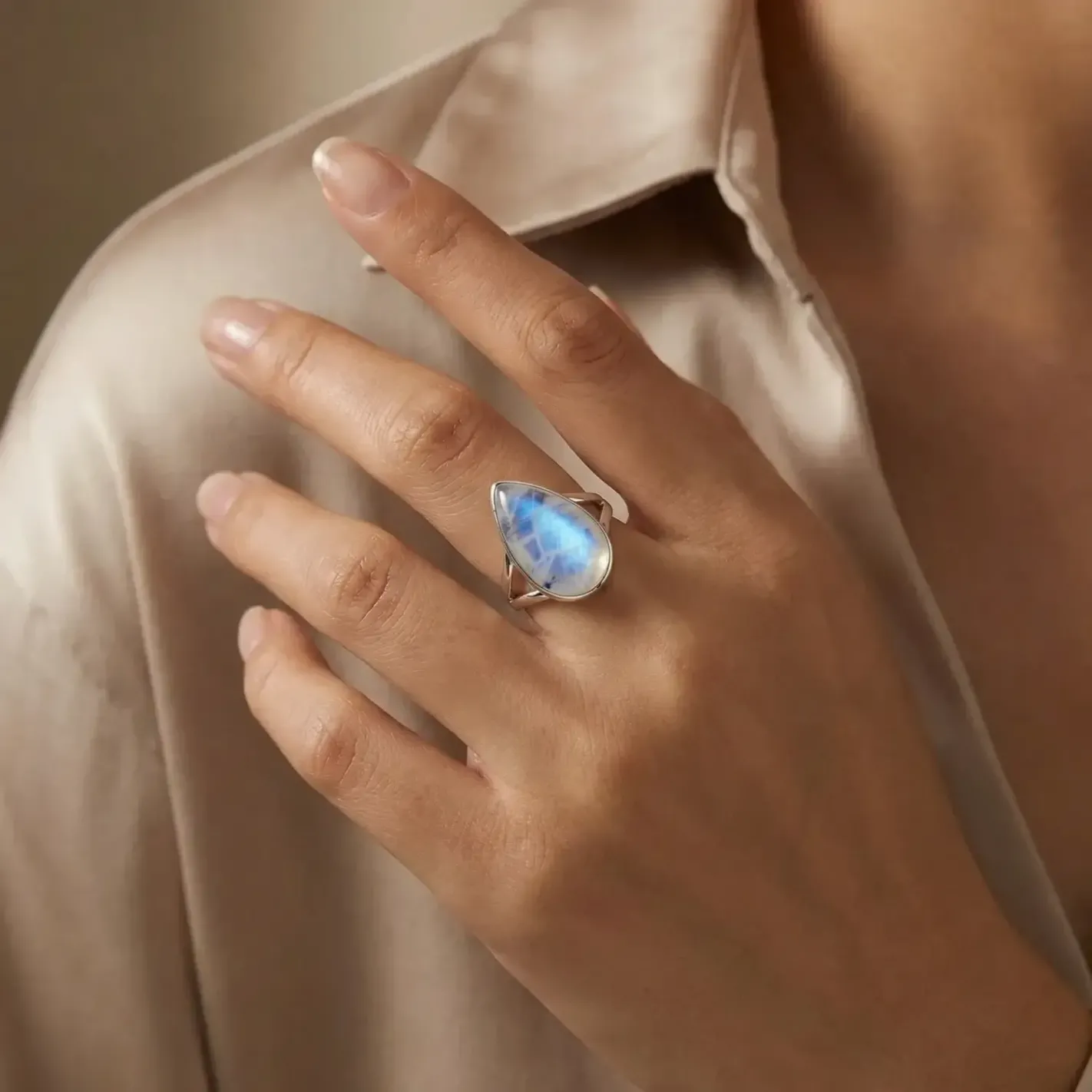 Bague Aelina Pierre de Lune naturelle, taillée en forme d’amande et montée sur argent. Une création délicate, entre mystère lunaire et élégance intemporelle.
