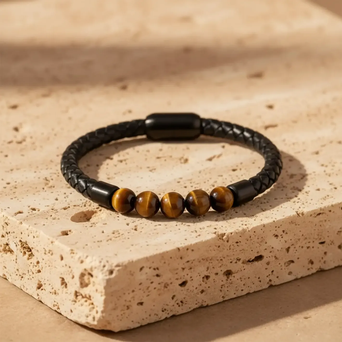Le bracelet en Cuir et Oeil de Tigre allie puissance terrestre et lucidité solaire. Il incarne la vigilance sacrée, la force tranquille et l’ancrage clairvoyant.