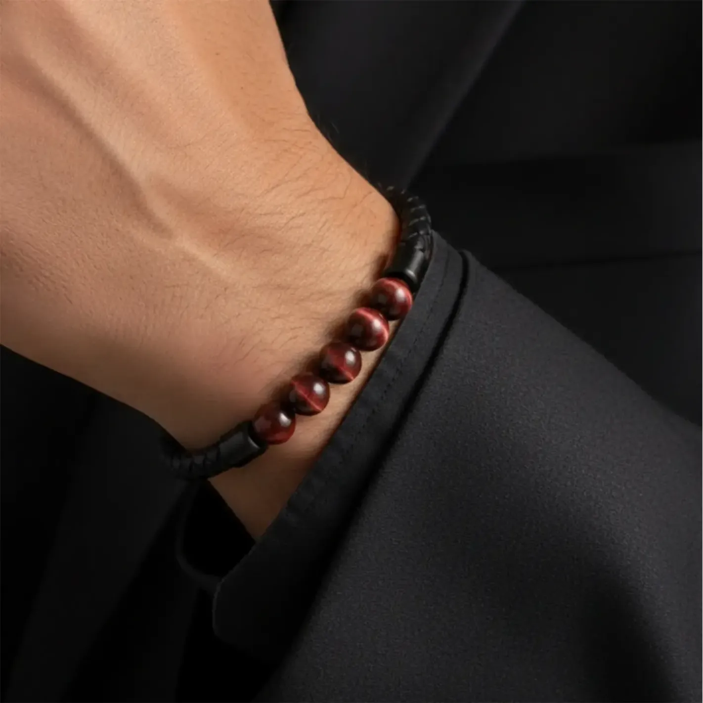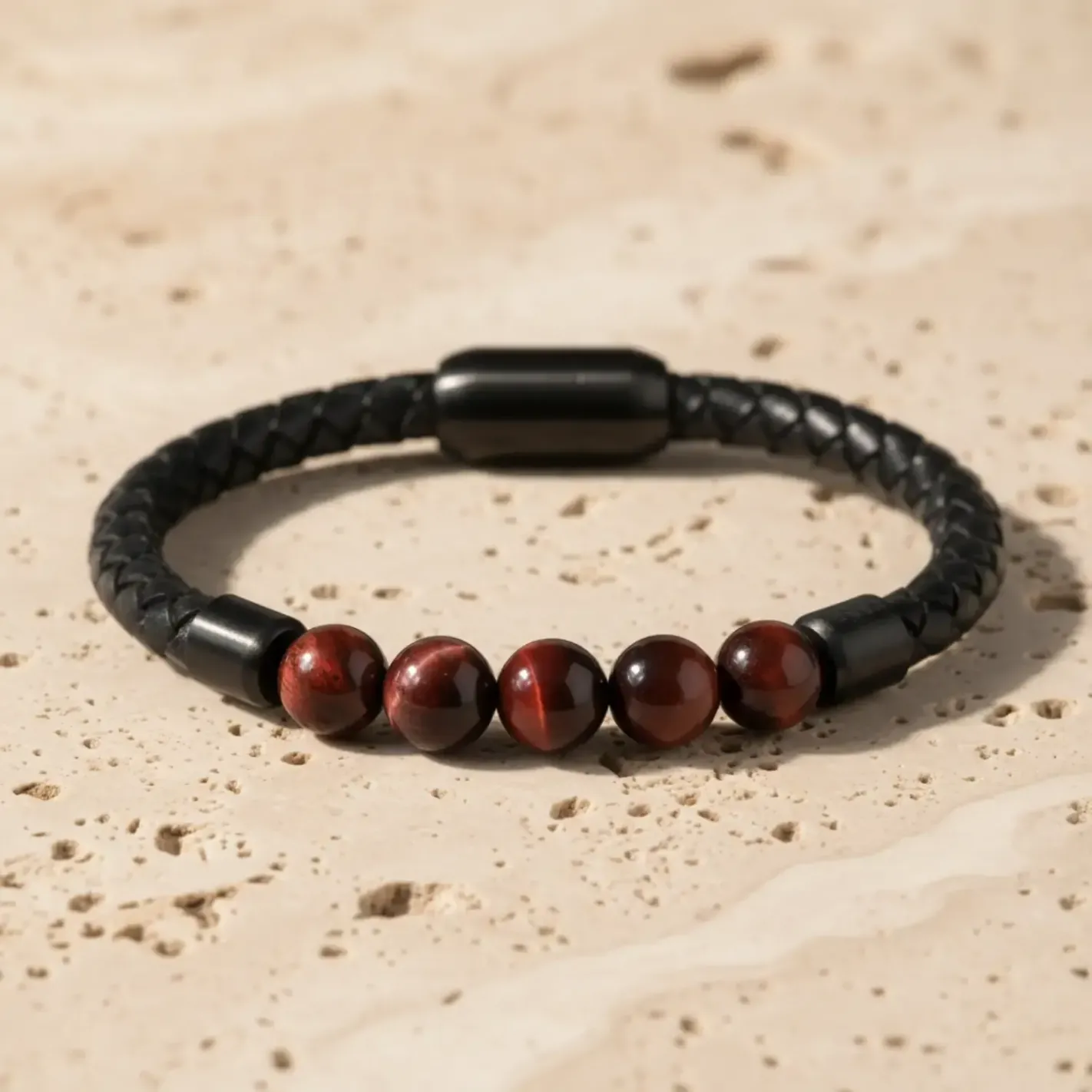 Exprime ta force intérieure avec ce bracelet en cuir noir, rehaussé de 5 perles naturelles d’œil de taureau – une pierre liée à la puissance vitale et à la stabilité émotionnelle.