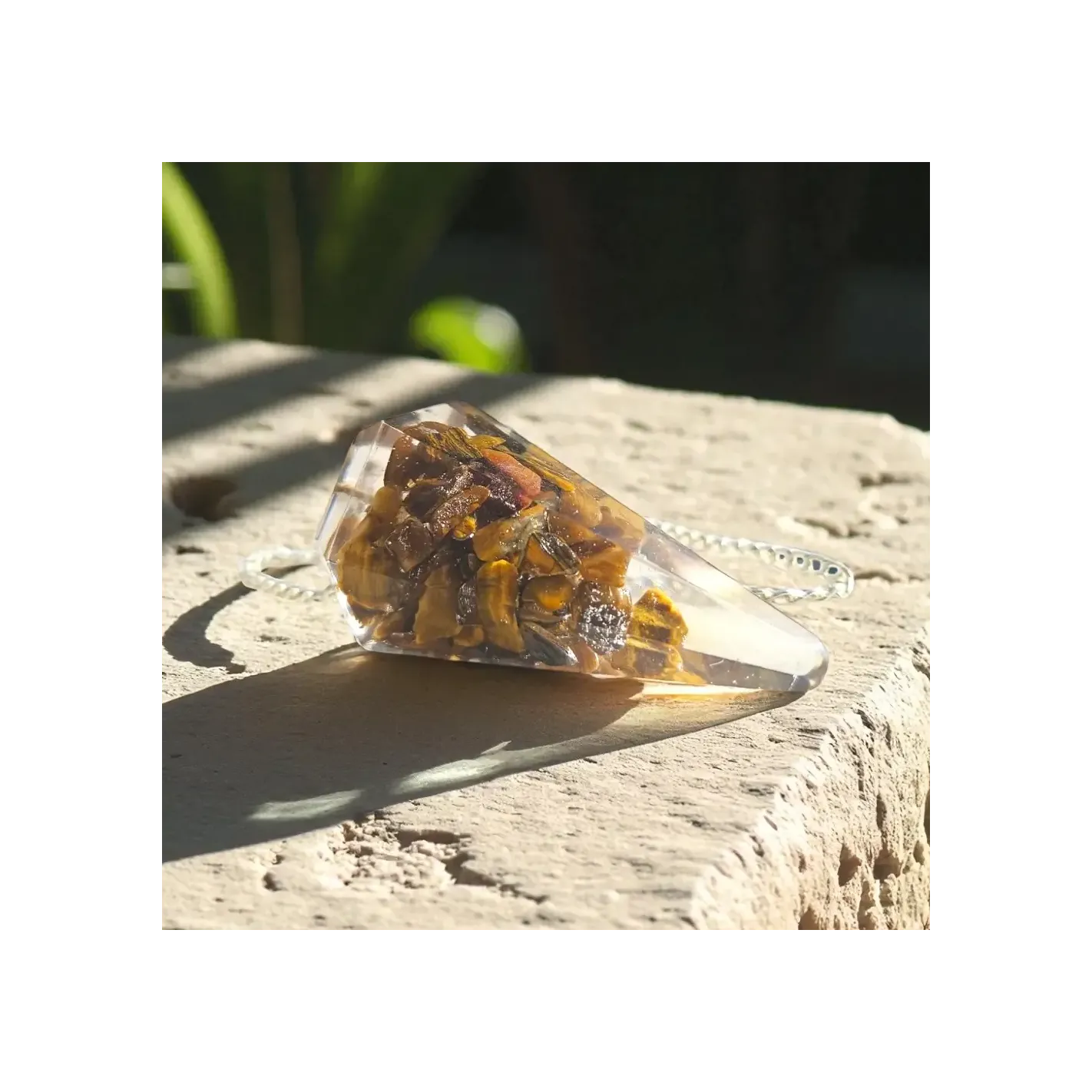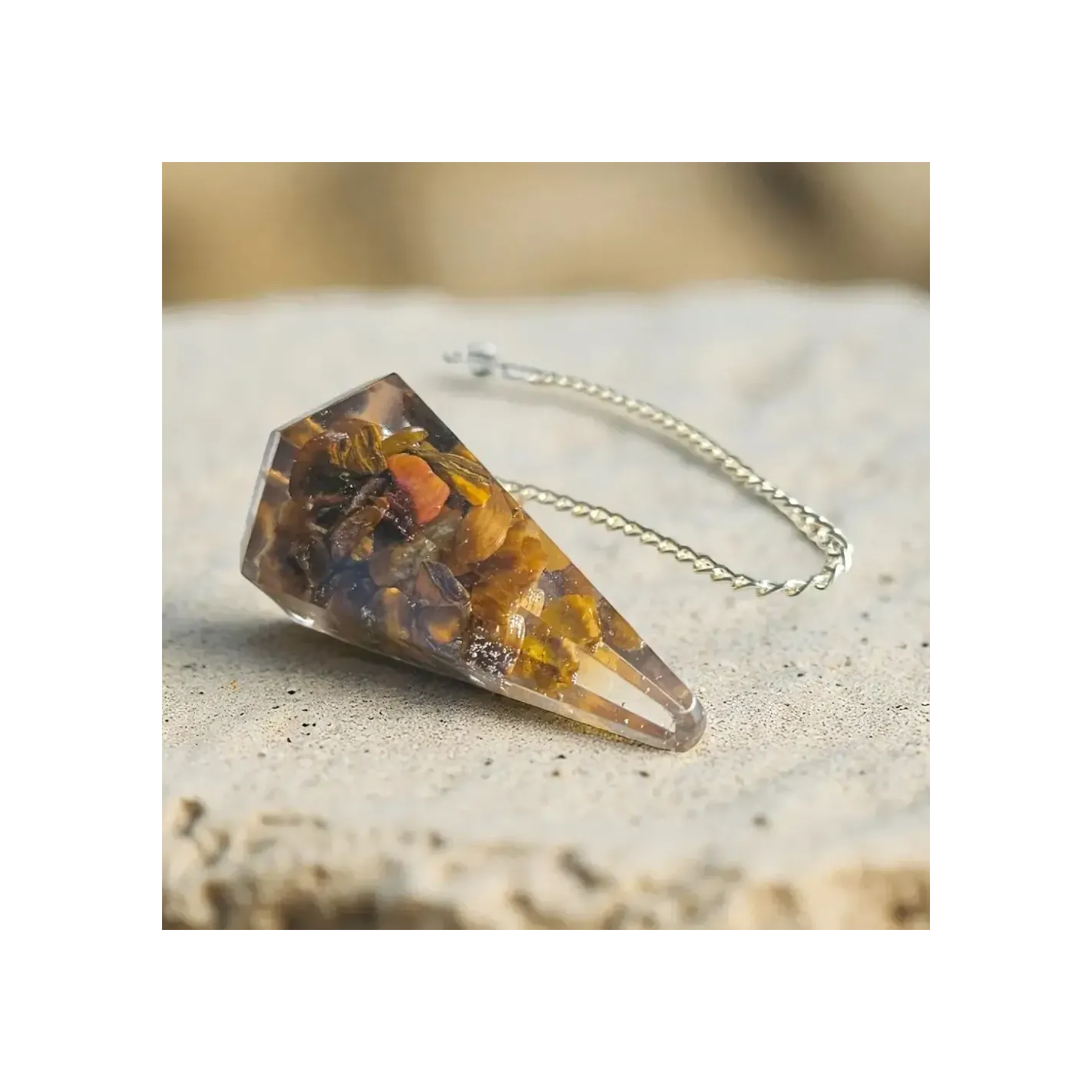 - Composants : Orgonite (résine, métal, œil de tigre)