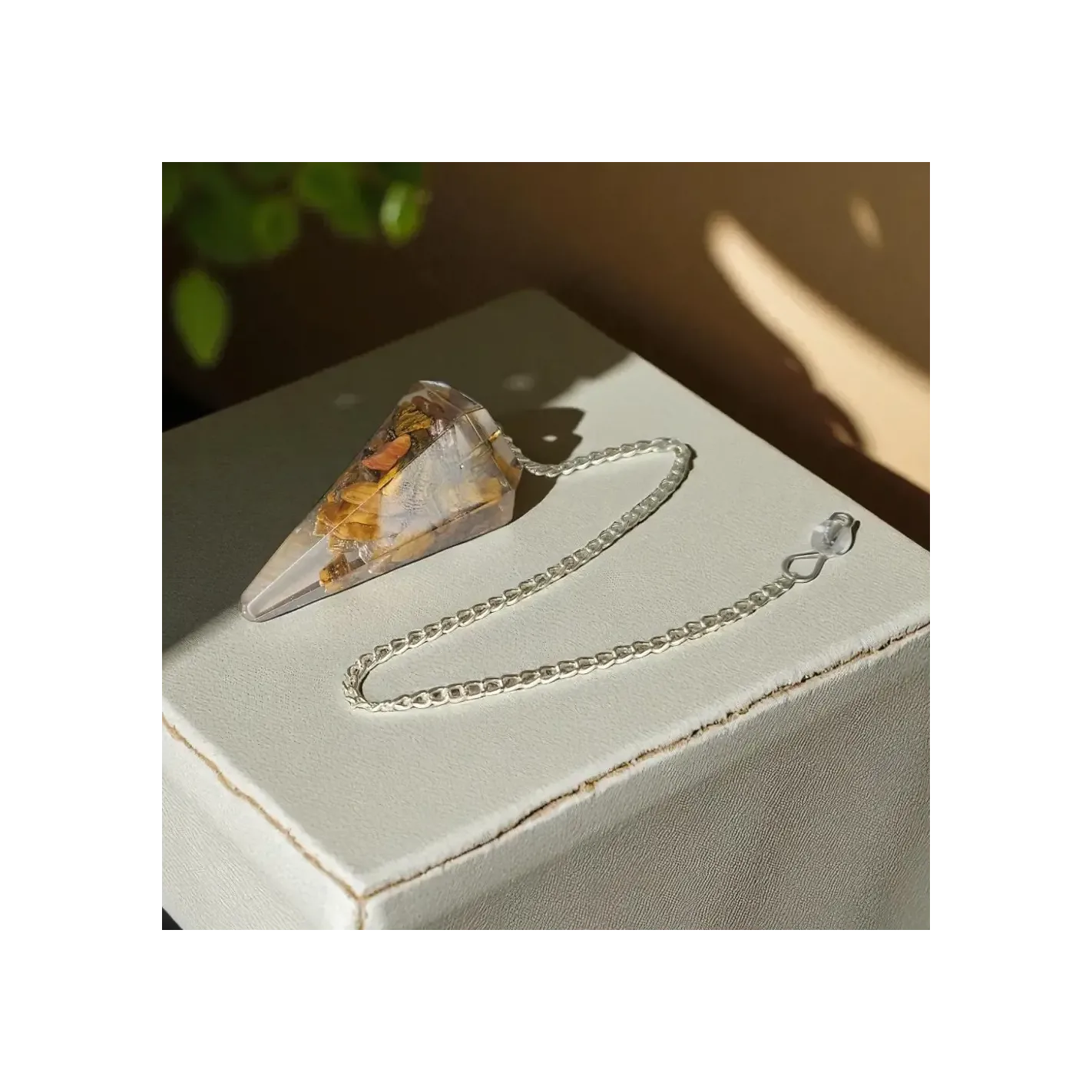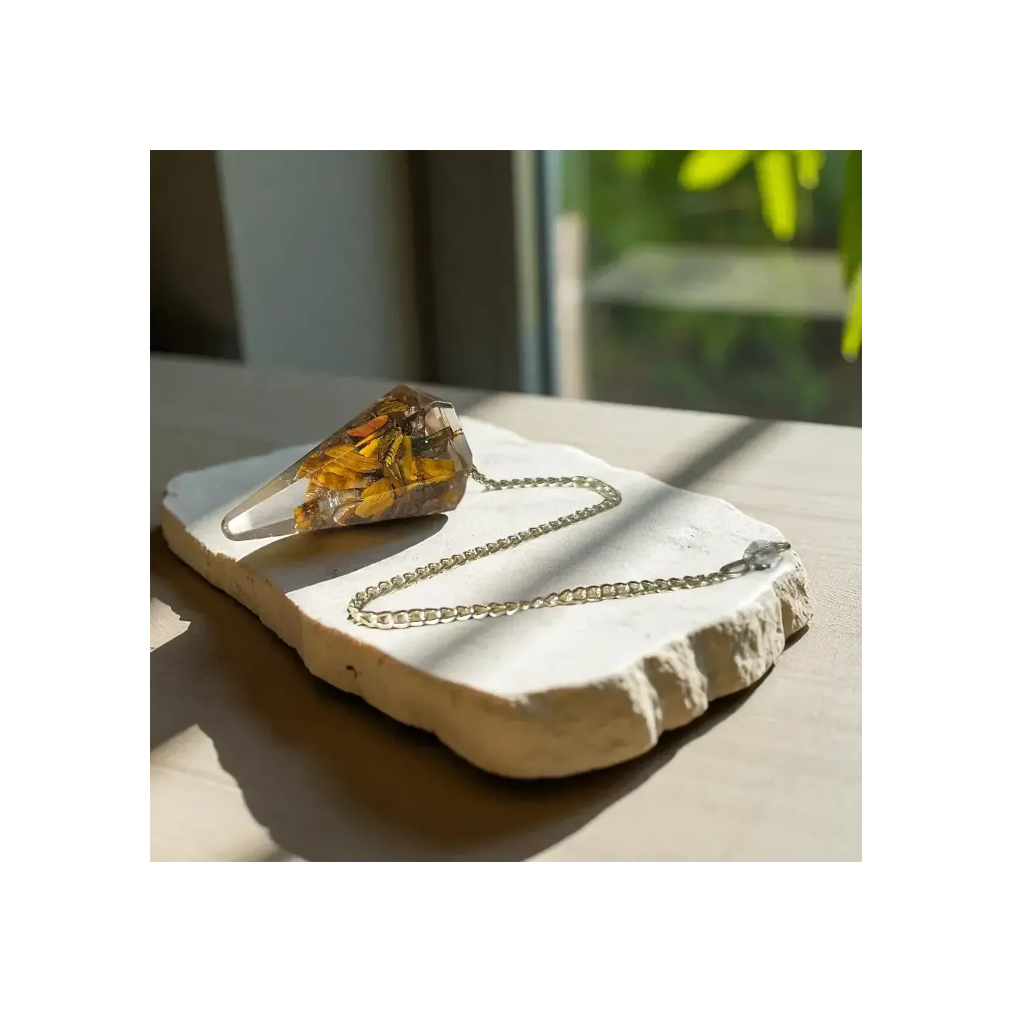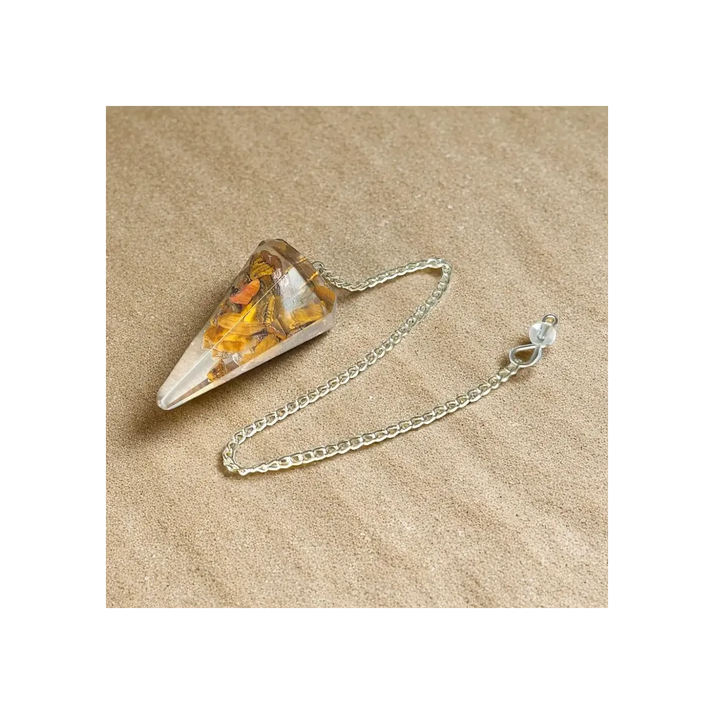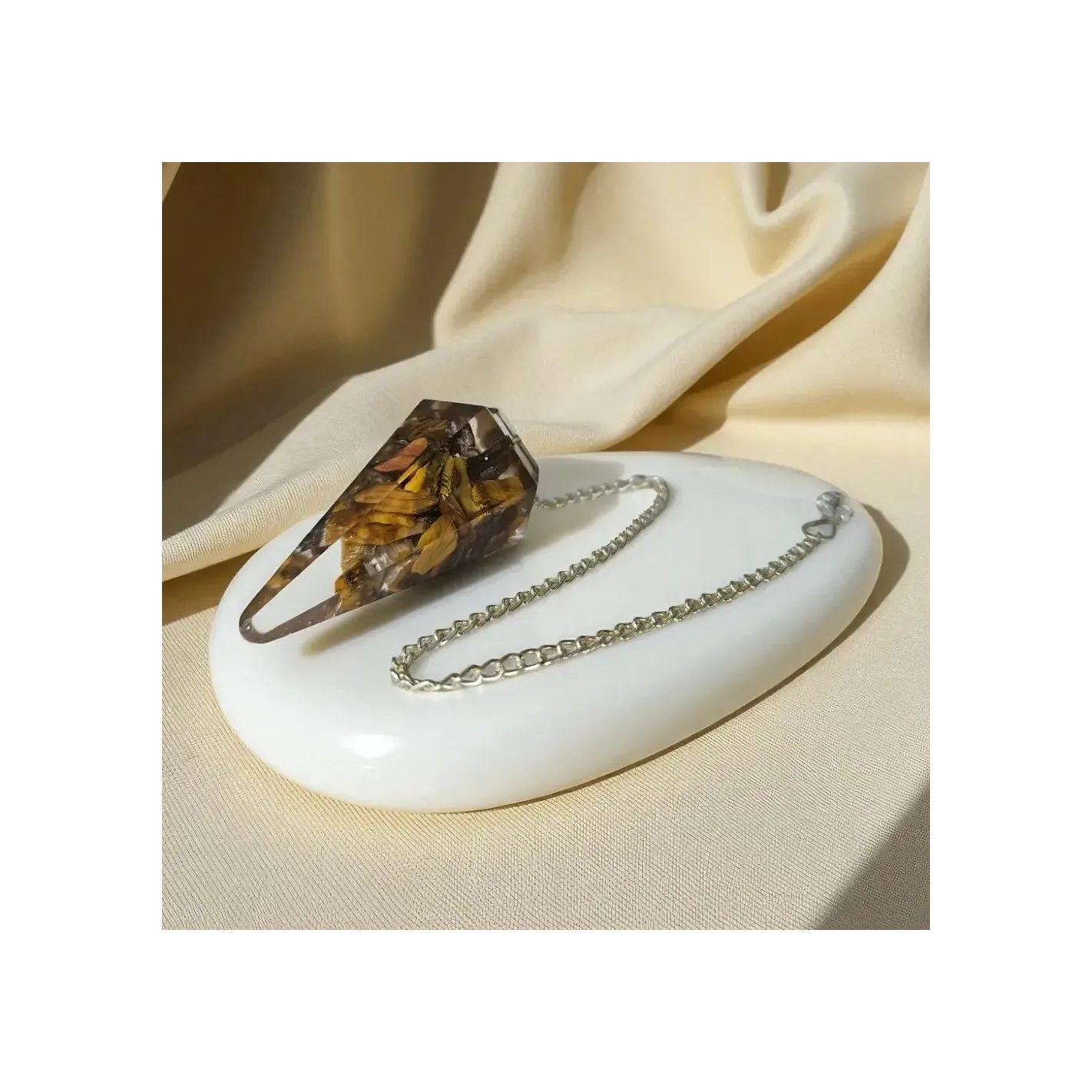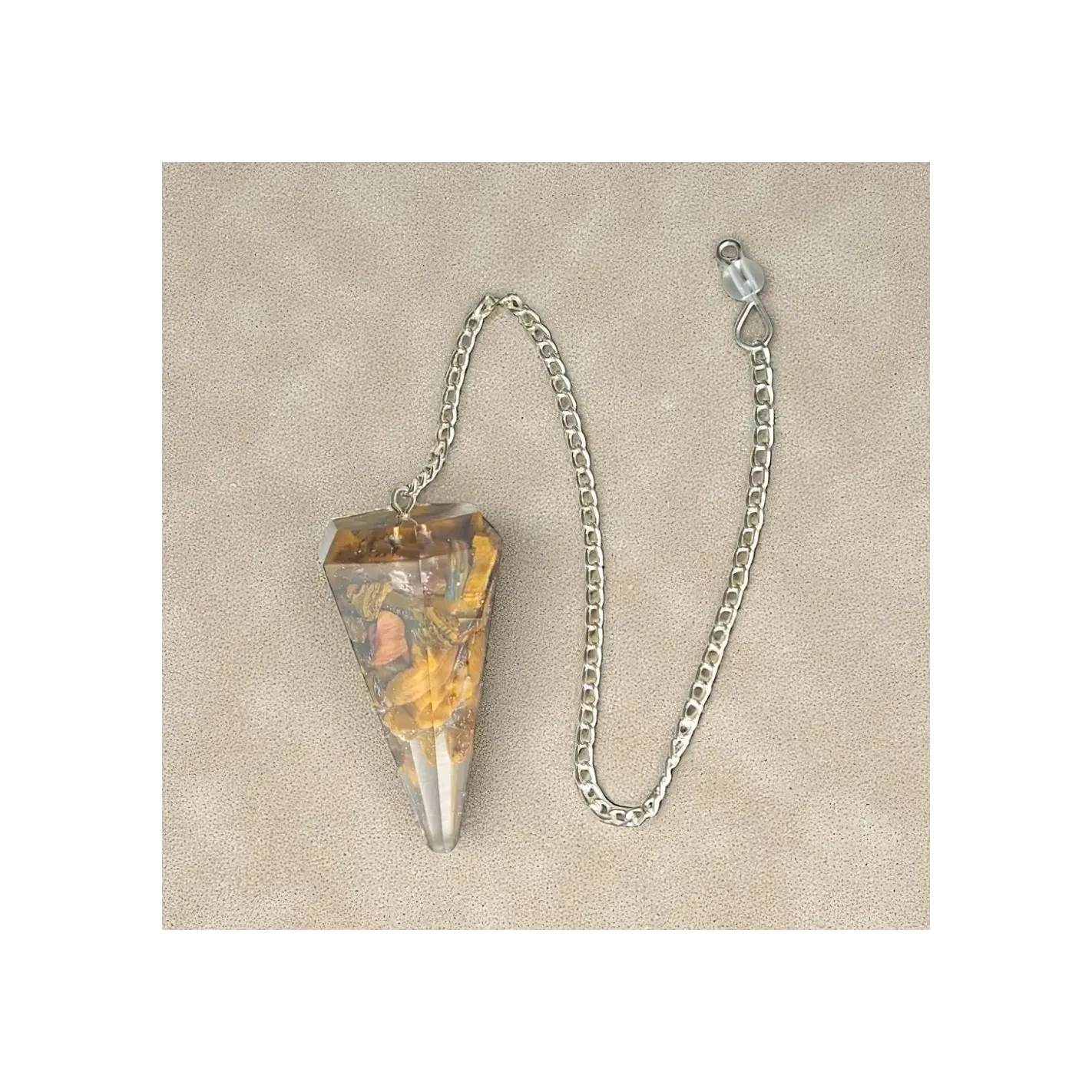 Un pendule protecteur et équilibrant, associant les propriétés de l’orgonite et de l’œil de tigre pour des guidances vibrantes et sûres.
