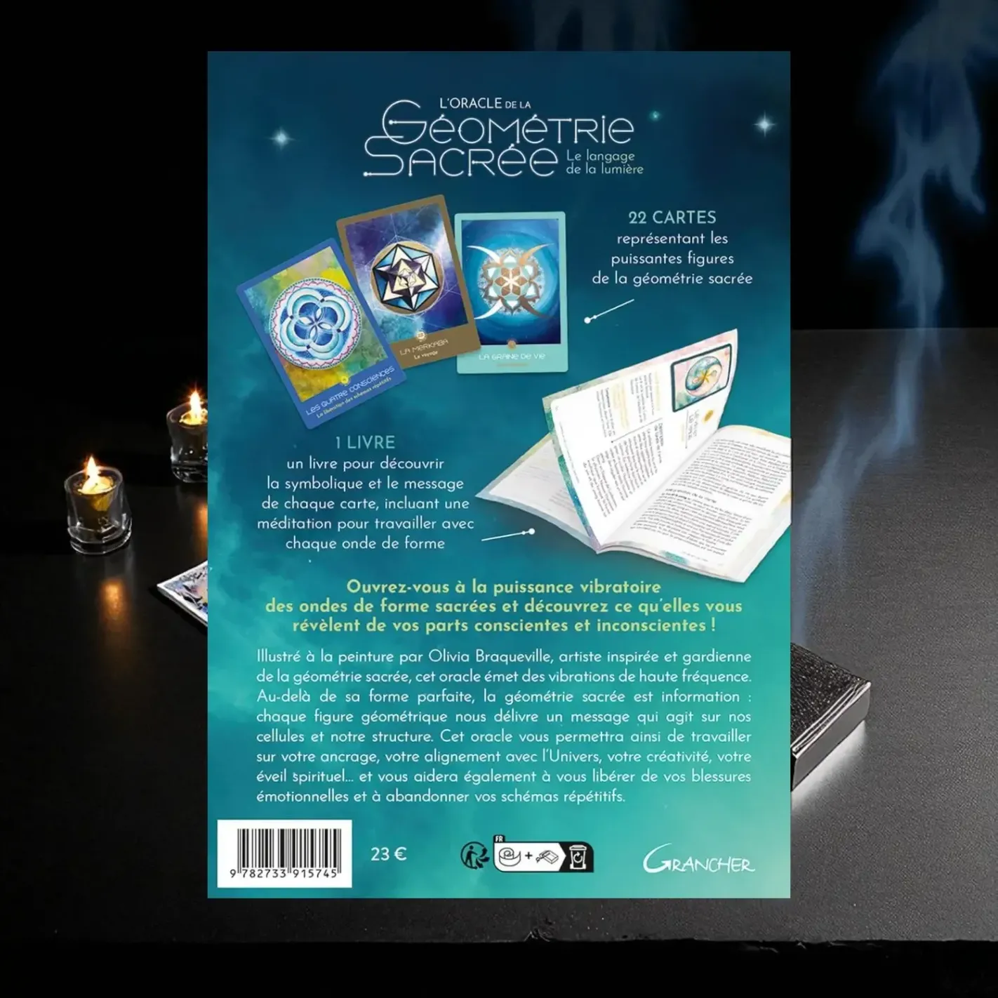 Illustré à la peinture par Olivia Braqueville, artiste et gardienne de la géométrie sacrée, ce coffret rassemble 22 cartes accompagnées d’un livret-guide pour décrypter le symbolisme et travailler les formes (fleur de vie, métatron, cubes…). Chaque carte est pensée pour stimuler l’ancrage, l’alignement universel, la créativité et l’éveil spirituel, tout en aidant à libérer les schémas émotionnels répétitifs