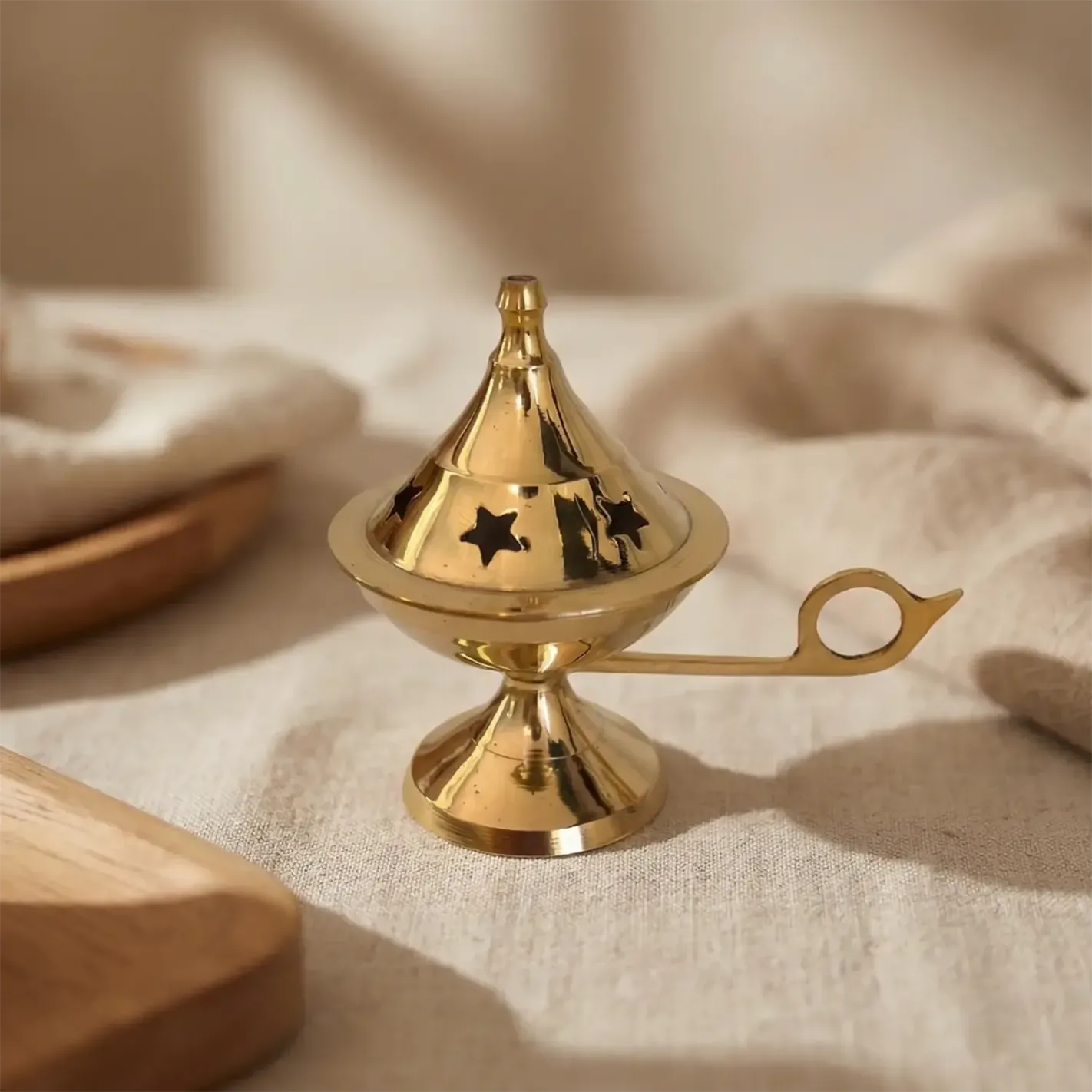 Apportez une touche d’Orient mystique à vos rituels avec ce brûleur à résine en laiton doré, inspiré du style lampe d’Aladin. Son couvercle délicatement ajouré d’étoiles laisse s’échapper la fumée en volutes élégantes, créant une atmosphère sacrée et enveloppante.
