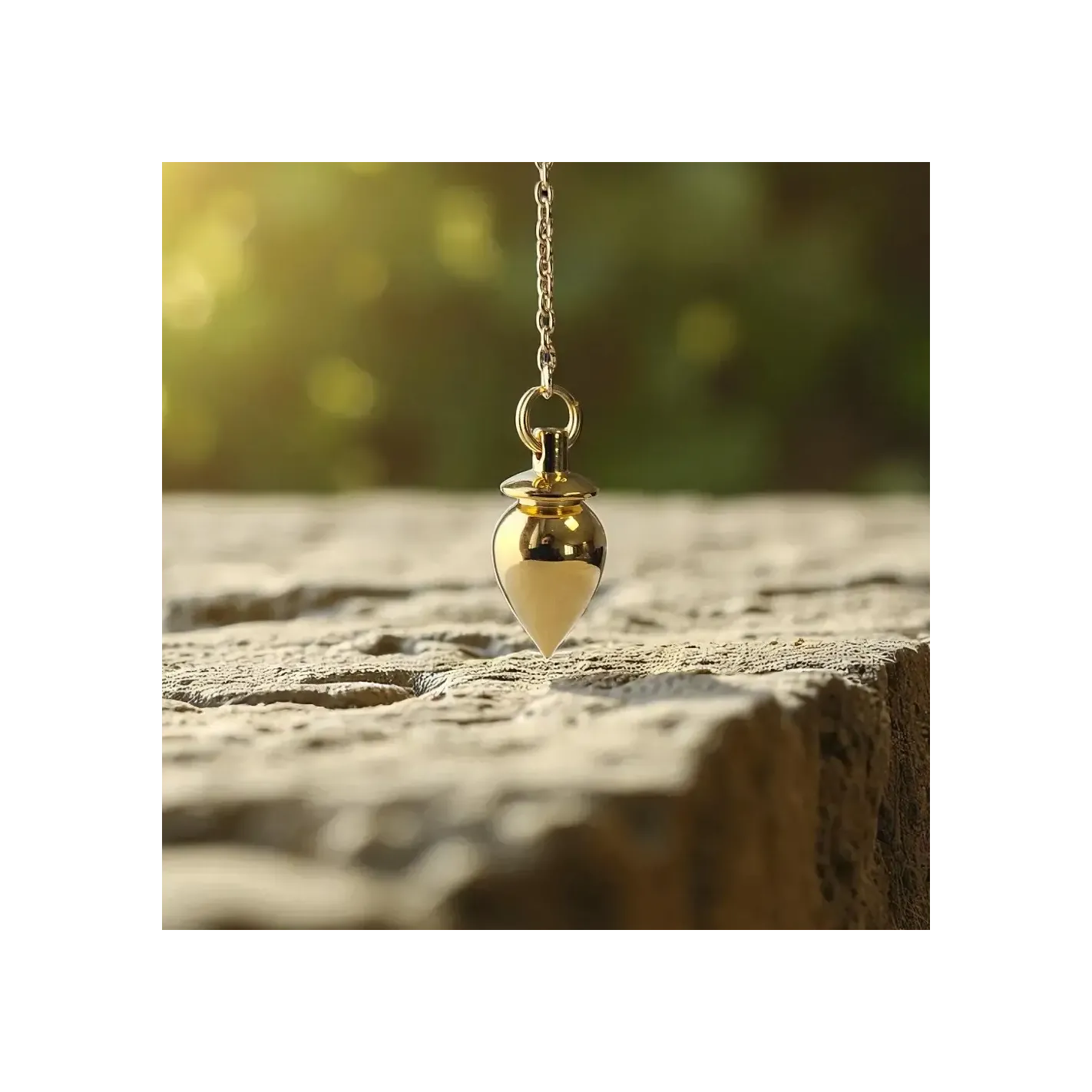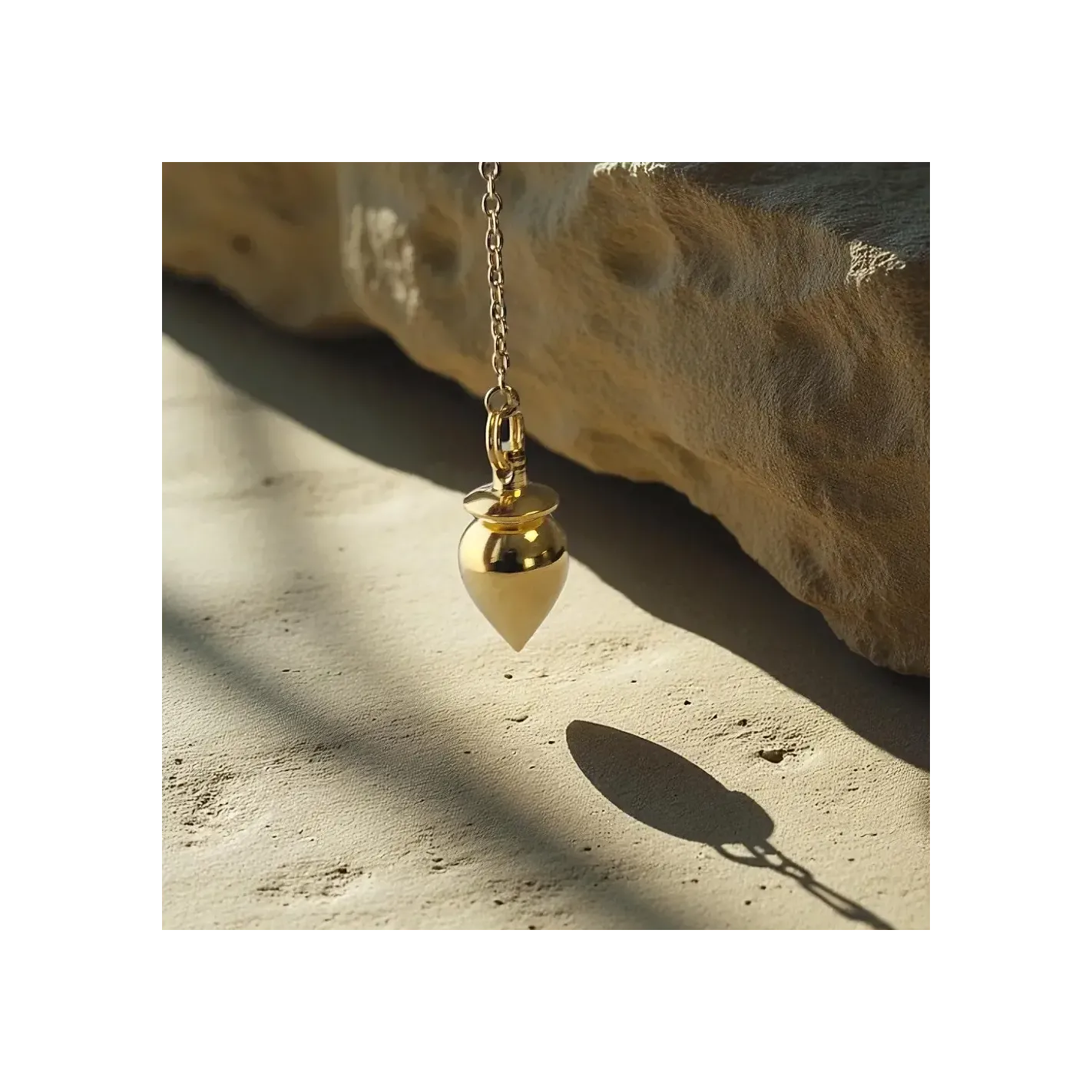 Ce pendule de radiesthésie se distingue par sa forme goutte, symbole d’équilibre et de fluidité, et sa collerette décorative en haut de la pièce. Sa finition dorée lui confère une vibration solaire, propice à l’élévation spirituelle et à la concentration mentale. L’alliance de sa silhouette fine et de sa stabilité vibratoire en fait un outil prisé pour les pratiques intuitives ou énergétiques.