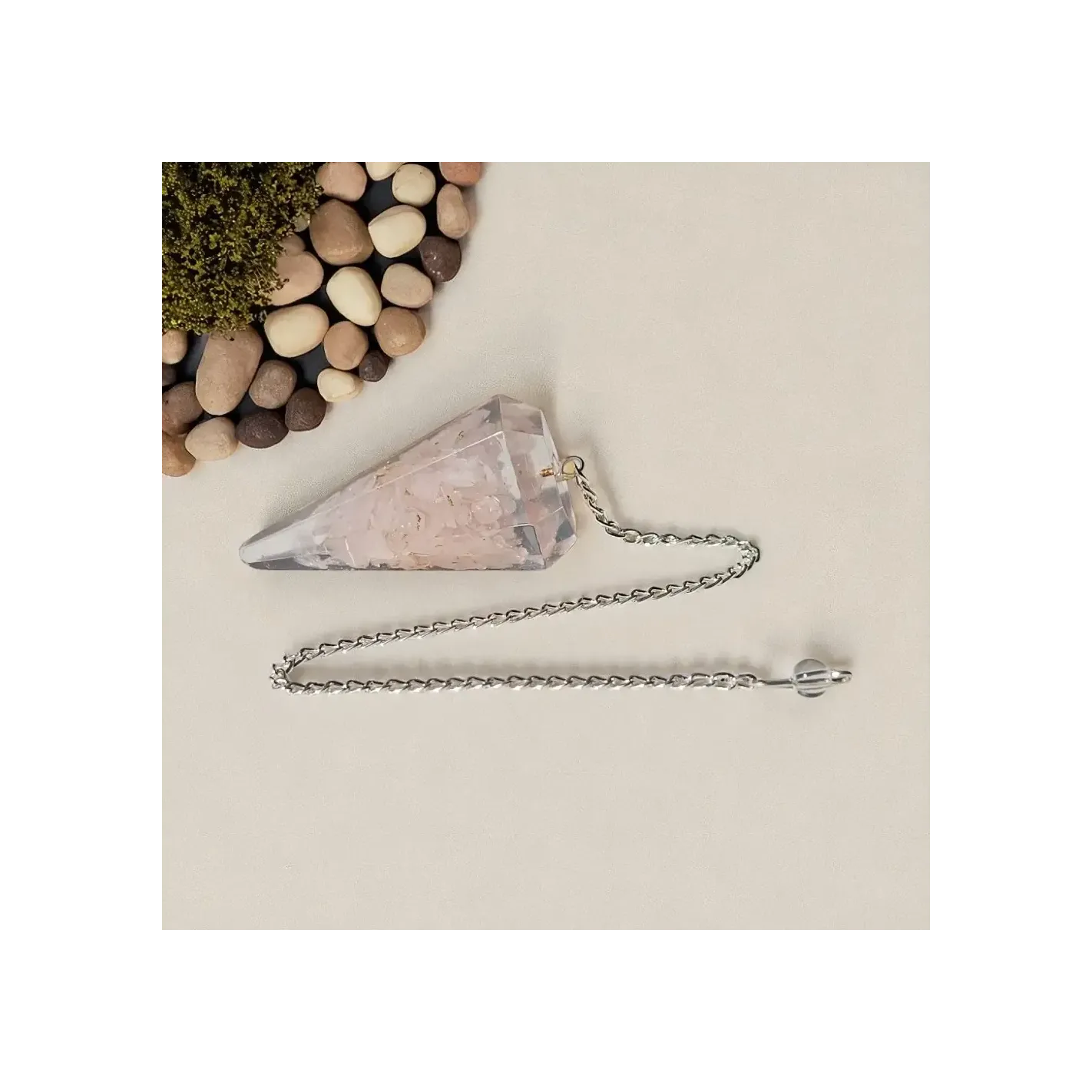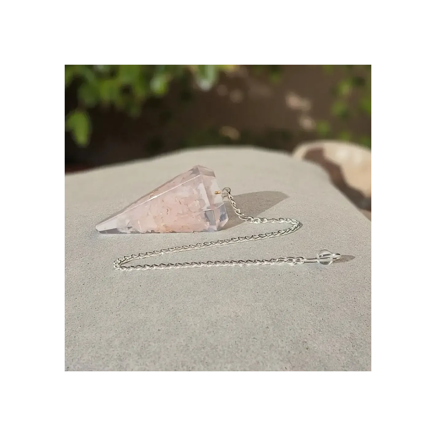 - Type : Pendule en orgonite avec quartz rose